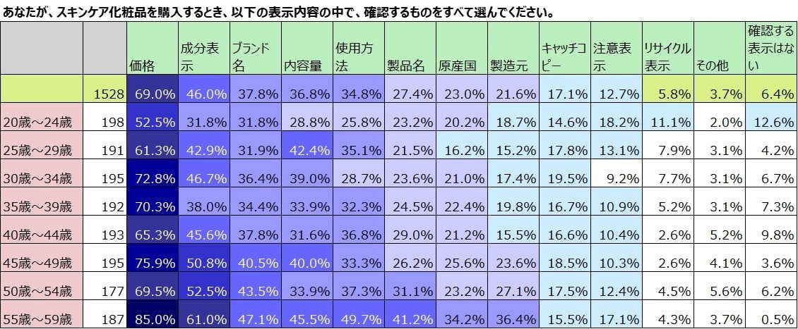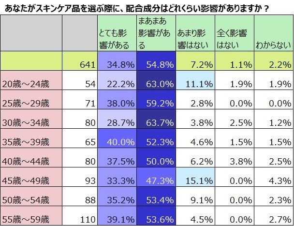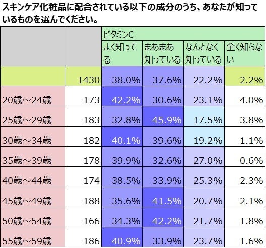 スキンケア品に配合している成分で最も魅力的なのは「ビタミンC」。20歳~39歳では 約5割。
