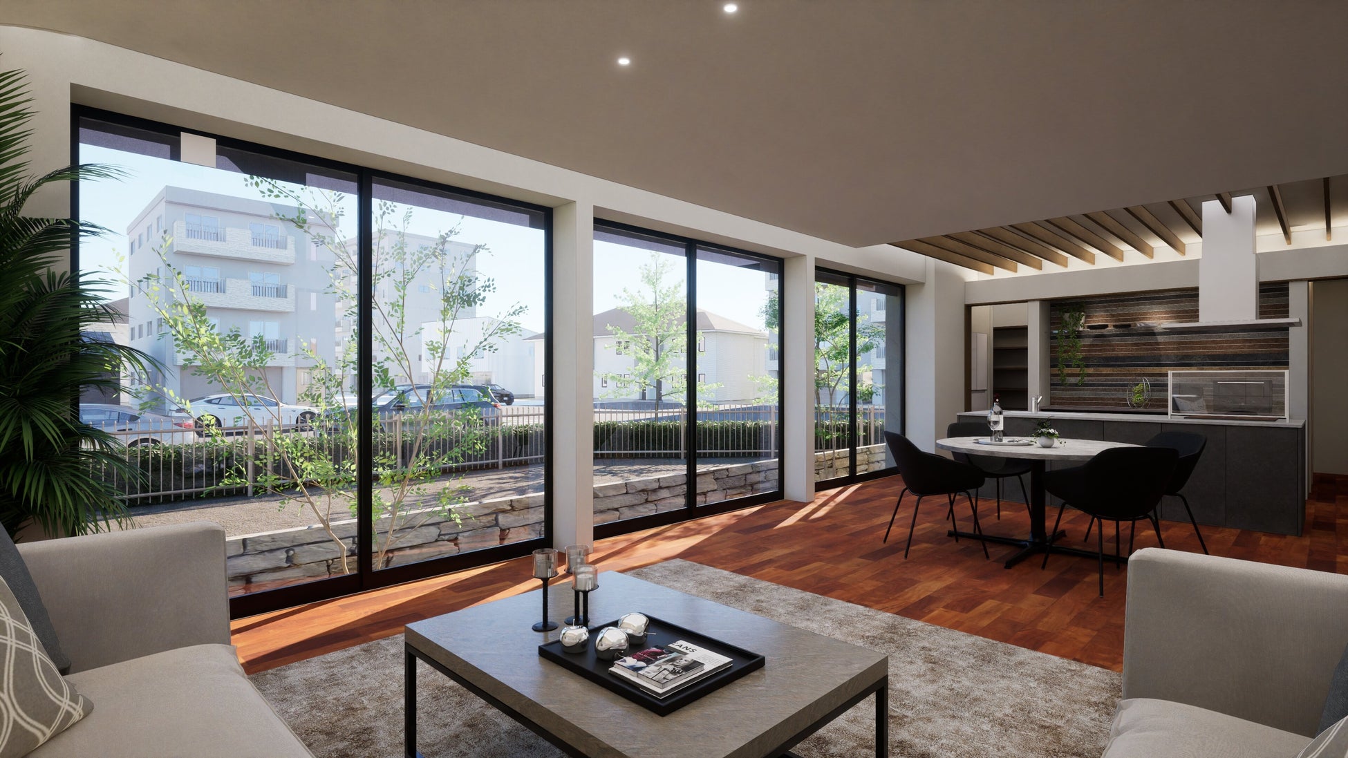 CLTハイブリッド構法により大開口と天井高2,600mmの開放的な空間を実現。R型天井を照らす間接照明や、キッチン上部に木製格子を採用することで上品で高級感のあるLDKへとデザインしております。