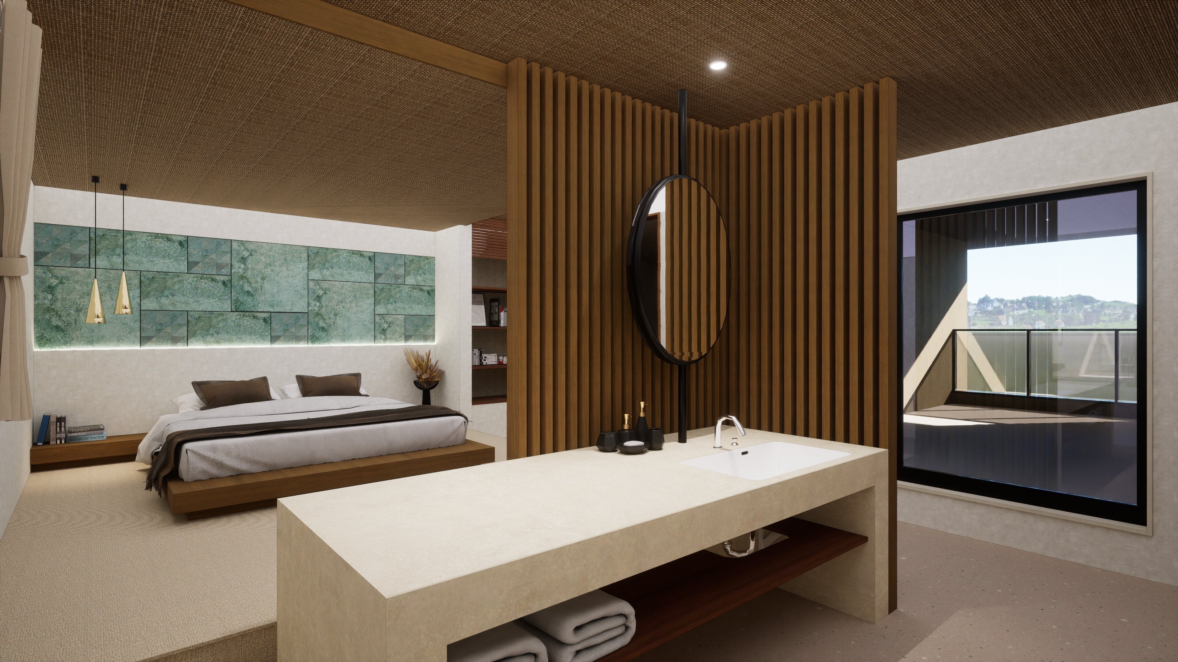 寝室の空間に洗面やシャワールームを併設した、リゾートホテルのようなつくり。壁面のタイルや間接照明による高級感もありながら、心地よい安らぎを感じることのできる仕上がりとしています。