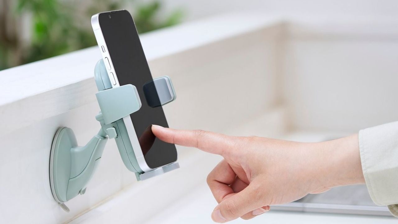 - キッチンの壁にくっつく吸盤タイプのスマートフォンホルダー