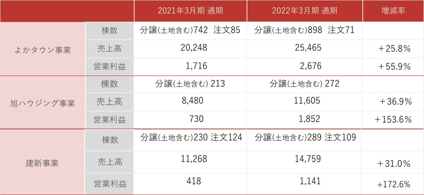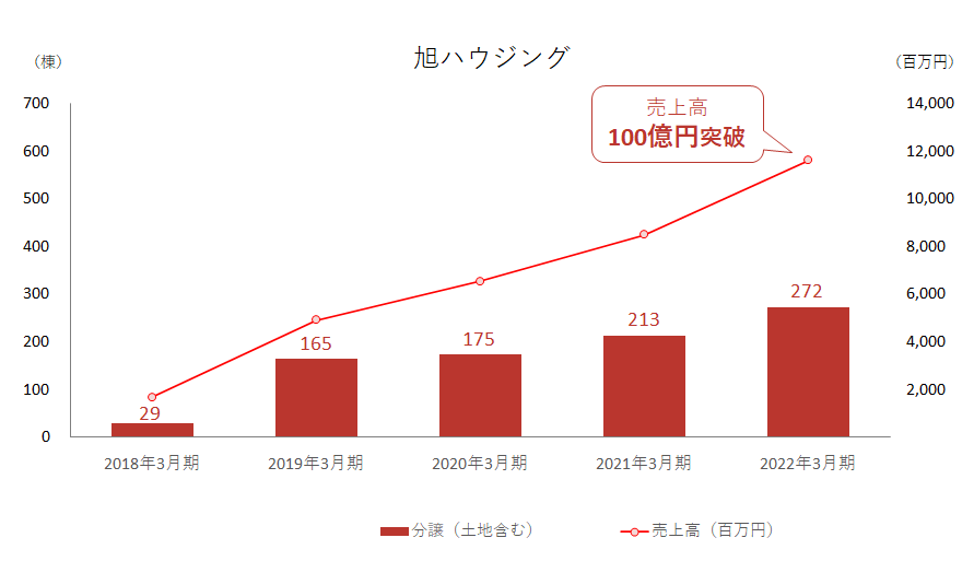 旭ハウジングも注文住宅をメインに展開しておりましたが、グループ入りをきっかけに完全に分譲住宅へと切り替えを行いました。その結果、2022年3月期には、当初の予定より1年程度早く100億円の売上高を達成し、売上高成長率はグループ会社の中で最も高い62%増となりました。さらに従業員数が69名(2022年11月1日時点)の少数精鋭の体制にも関わらず、2022年10月末時点で出店エリアは3県(埼玉、東京、神奈川)で計8店舗に拡大しており、非常に高い生産性を維持しながら成長を加速させています。