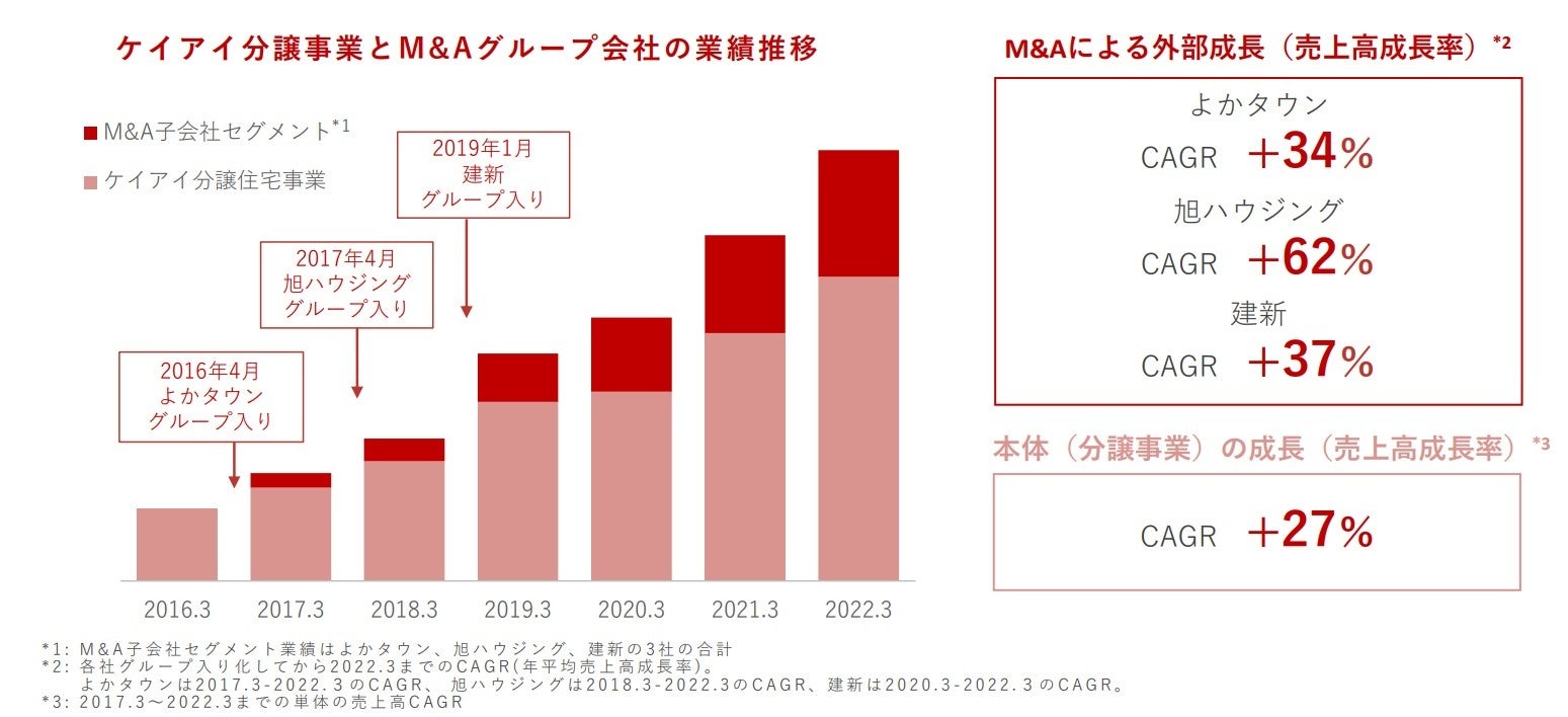 ケイアイスター不動産株式会社(本社/埼玉県本庄市、代表取締役/塙 圭二、以下「当社」と言う。)は、さらなる規模の拡大を目指し、ケイアイスター不動産グループ(以下「当社グループ」と言う。)のM&Aを強化します。2022年3月期において当社グループは、グループ連結数値で5,481棟を販売し、売上高は前年比18.4%増収の1,843億円と過去最高を達成しました。要因の1つとしてグループ会社の本体以上の高い成長率があげられ、規模拡大におけるM&Aの寄与は大きいと言えます。