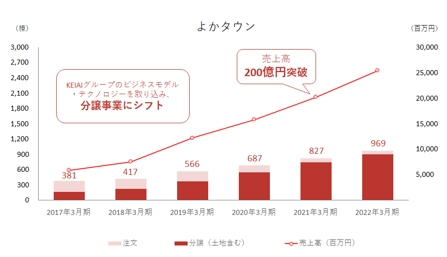 当初よかタウンは、注文住宅事業をメインに展開しておりましたが、当社グループ入りを機に戸建分譲事業にシフトし、既存の商品に加え、当社の商品である「FiT(フィット)」、「Ricca(リッカ)」を販売してきました。その結果、2021年3月期には売上高200億を突破し(※2)、現在、戸建住宅着工棟数ランキングにおいて、3年連続で低層住宅着工棟数福岡県第1位に輝いています(※3)。