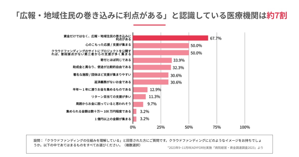 特に病院広報の観点では、クラウドファンディングが「広報・地域住民の巻き込みに利点がある」と認識している医療機関は約7割(※3)であり、自院の取り組みを地域に広報発信するための手段と捉えていただく医療機関が増えています。
