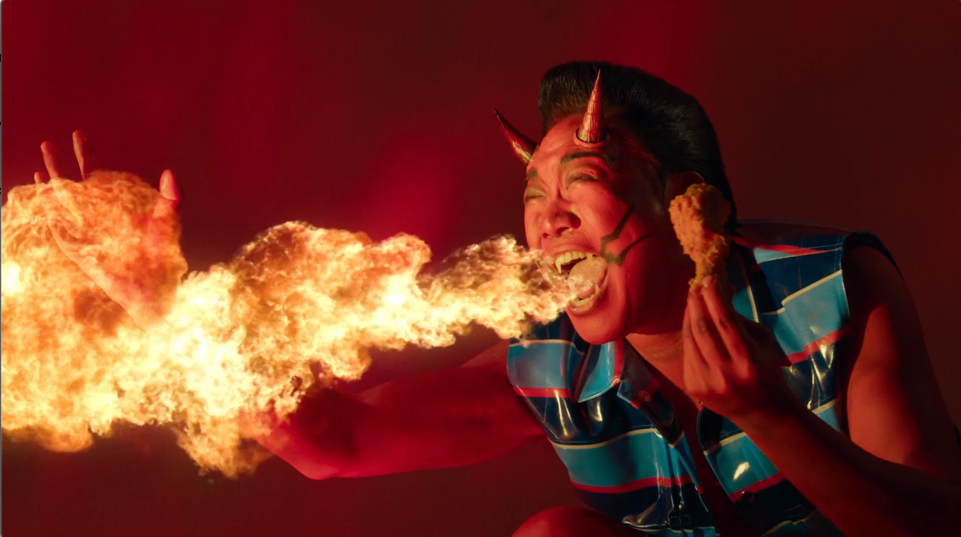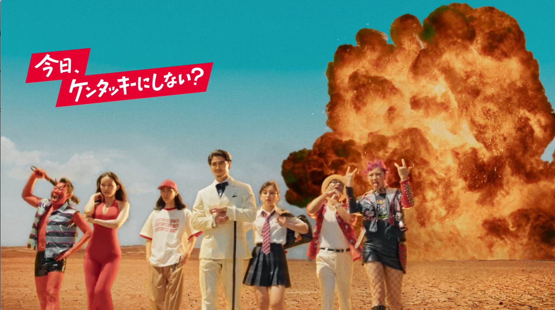 新CMは、カーネル・サンダースに扮する賀来賢人さんを中心に、みやぞんさん演じる赤鬼と個性的な装いの「レッドホットチキン」ファン7人が並び「20周年の夏が来た!」というセリフから始まります。20周年を迎え気持ちが昂っている様子を演じていただきました。勢いよく「レッドホットチキン」を頬張る人、辛さでつい顔をあおぐ人、水をがぶ飲みする人、辛くて火を噴く赤鬼、目の中に炎がメラメラ燃えている賀来さん。まさに、愛され続けて今年で20周年を迎える、KFC夏の定番「レッドホットチキン」を存分に感じていただけるCMです。最後はお馴染みの「今日、ケンタッキーにしない?」のセリフとともに7人が燃え上がる炎をバックに歩くシーンで締めくくります。