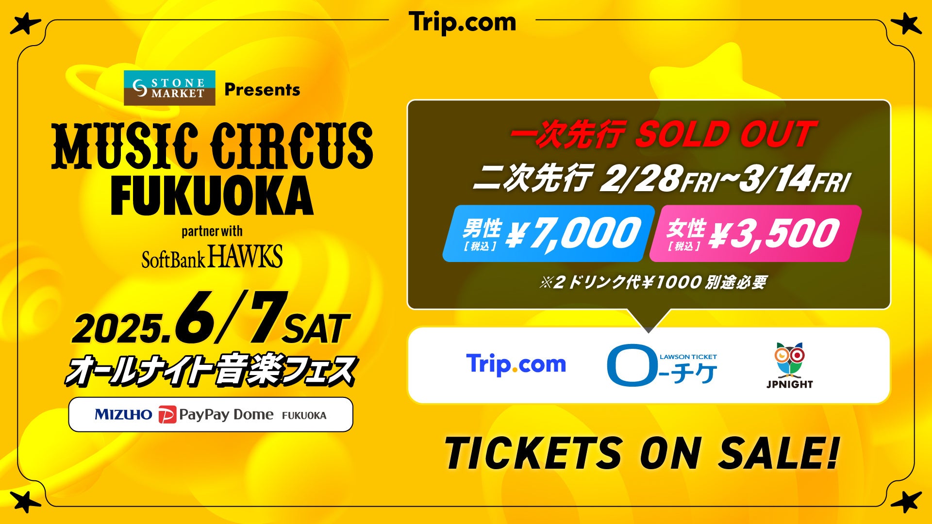 株式会社TryHard Japan(大阪市中央区)は、2025年6月7日(土)にみずほPayPayドーム福岡で開催されるオールナイト音楽フェス「STONE MARKET Presents MUSIC CIRCUS FUKUOKA partner with SoftBank HAWKS」の第2弾出演アーティストを発表いたします。