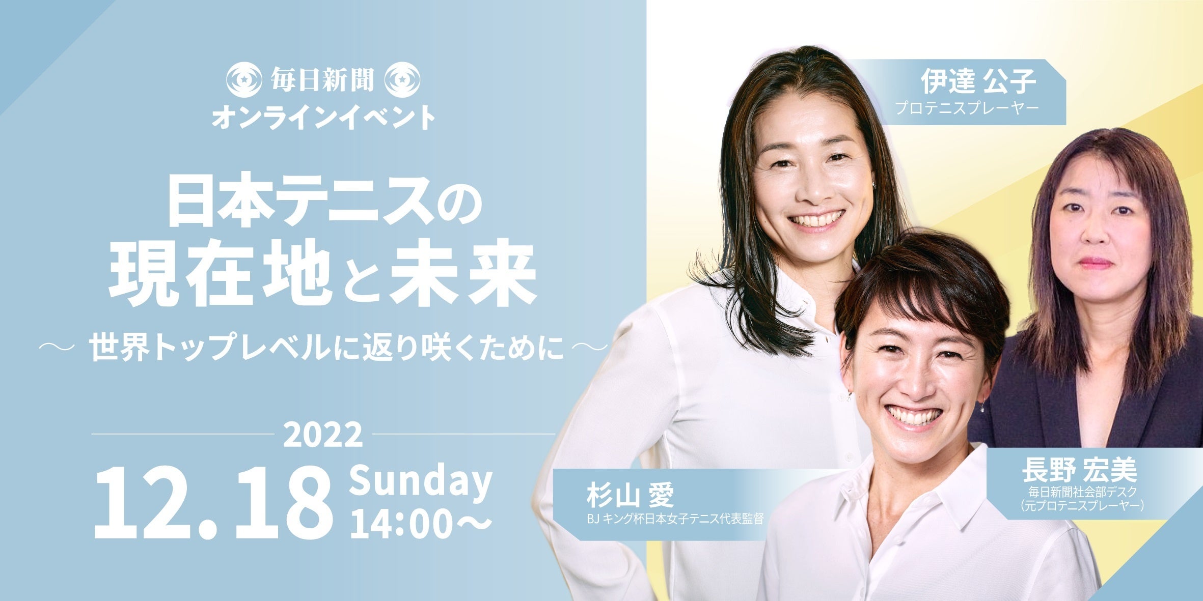 日本テニスの現状に危機感を抱き、次世代のプレーヤーに向けて様々な機会を提供するべく、元世界ランク4位の伊達公⼦さん、8位の杉⼭愛さんらが理事となり6月に創設されたJWT50。1919年に誕生した日本最古・最大規模のテニストーナメント「毎日テニス選手権」を主催し、テニスの裾野拡大に取り組む毎日新聞社。両者が手を組み、トップの経験を共有するトークイベントを開催します。