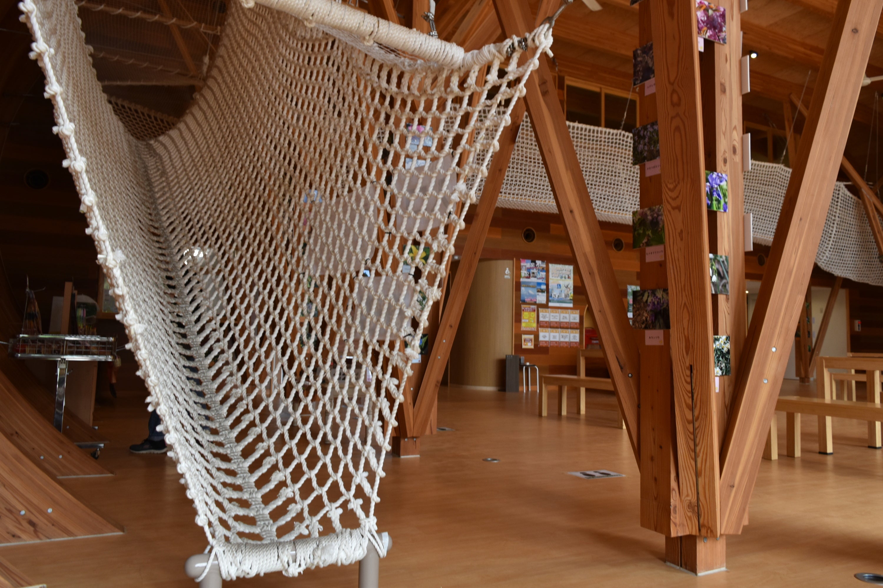 ネット渡りなど、多彩な遊びが連続した吹き抜け部分を回る「こどもアドベンチャー」