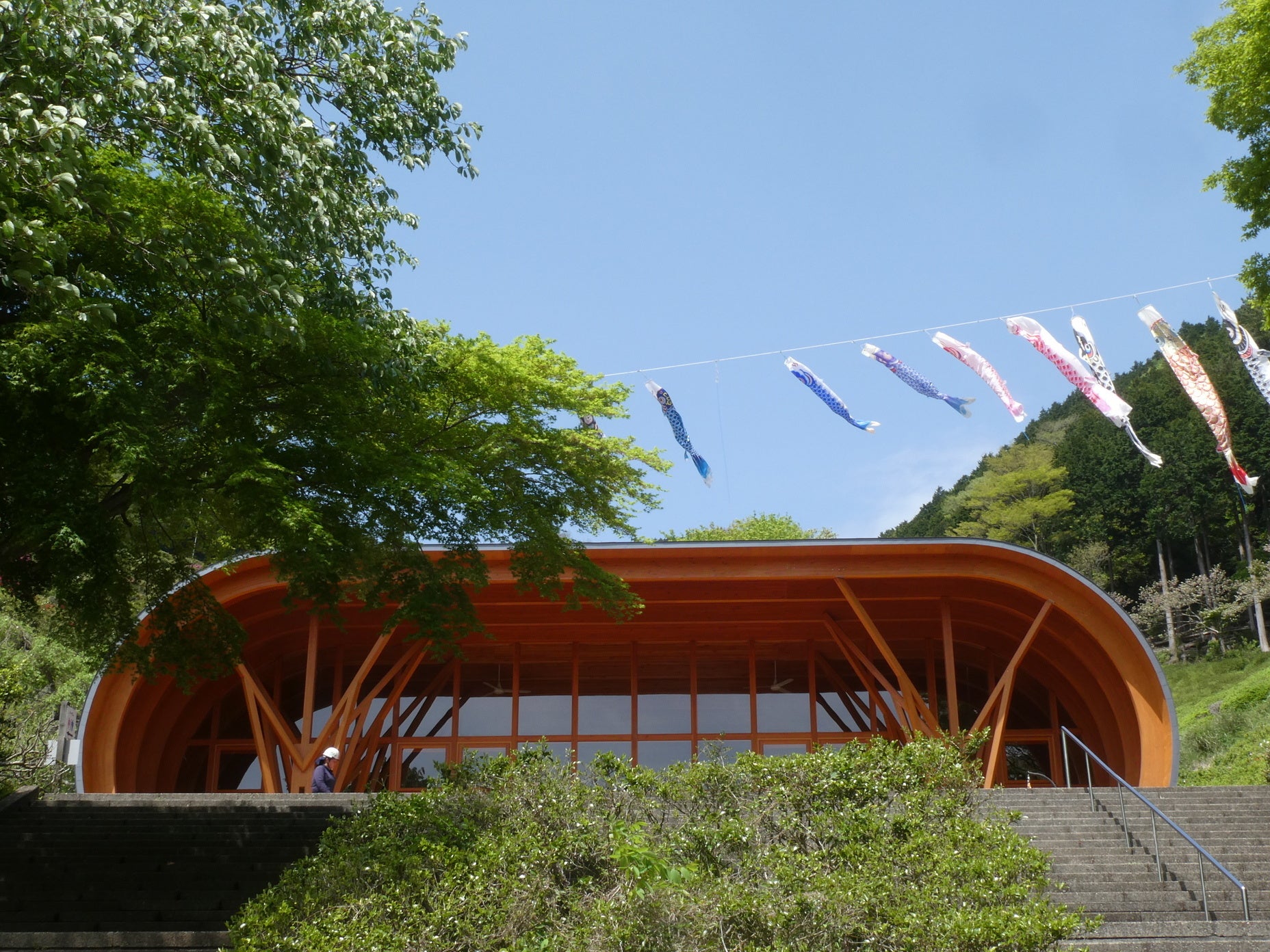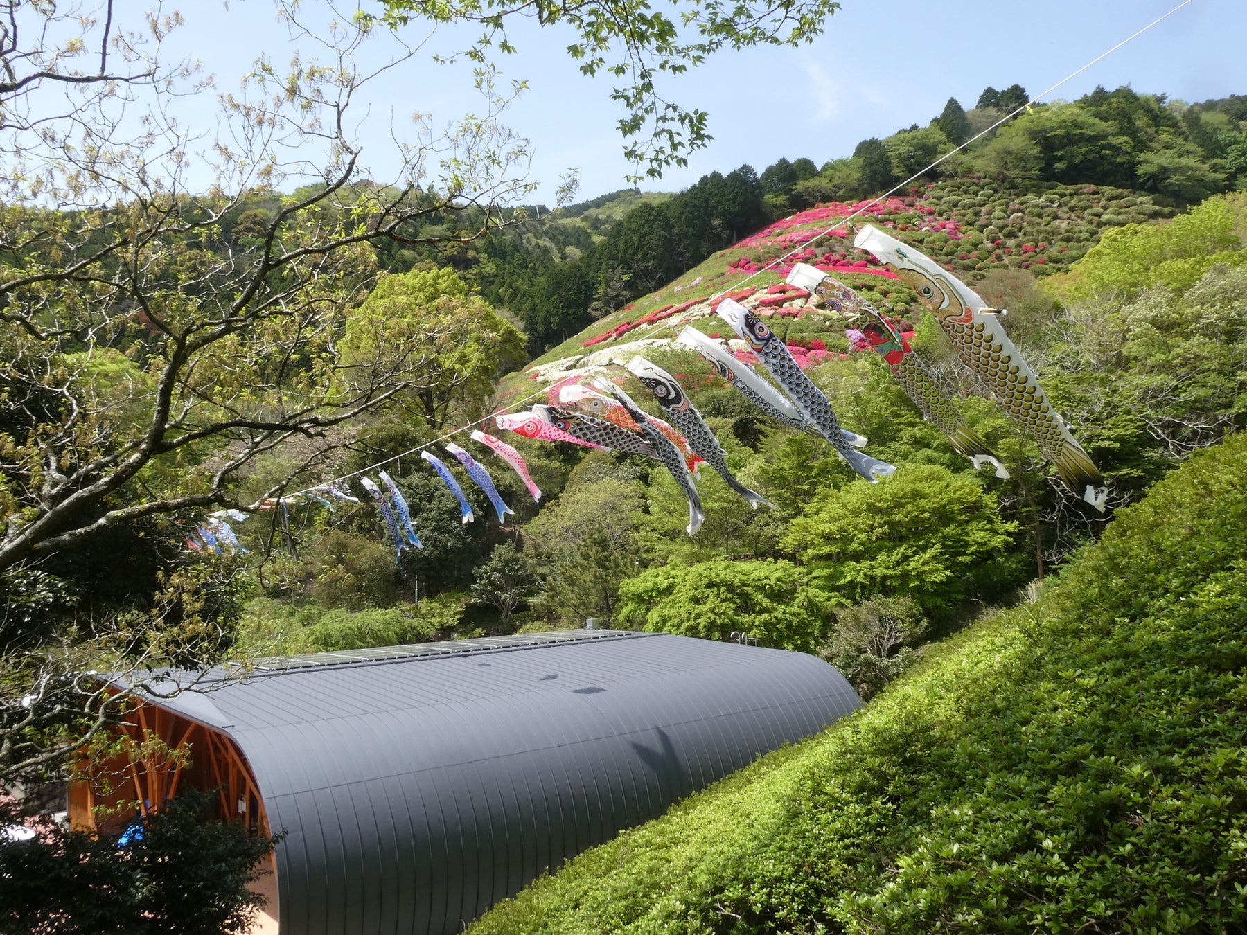 熱海市姫の沢公園「ビジターセンター」と花まつり期間中の「こいのぼり」