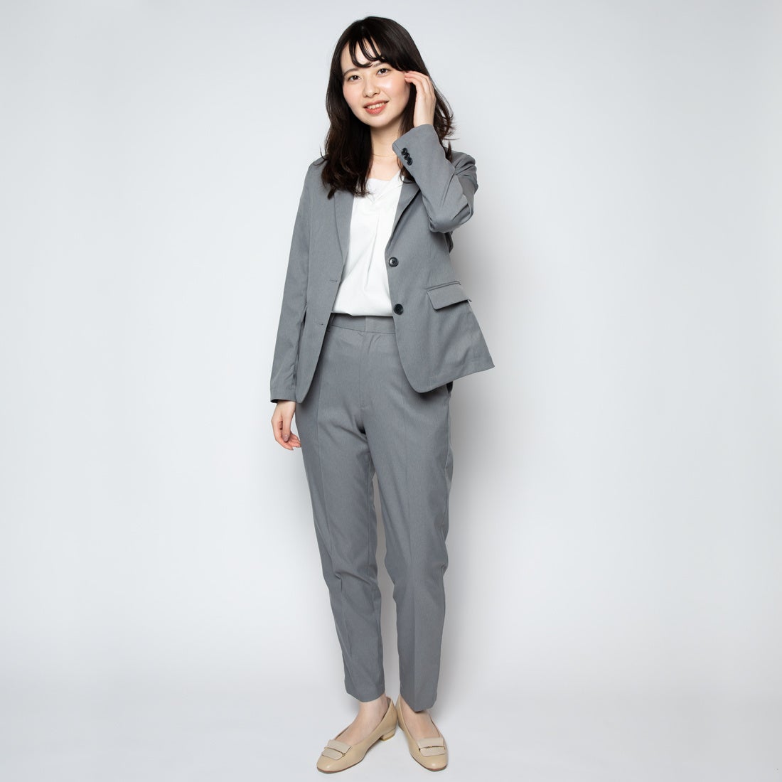 特徴:ジャケットパンツともにボディラインを拾いすぎない程よいフィット感にこだわりました。ジャケットは、Vゾーンが綺麗に見える位置にボタンを配置し、スマートな印象を与えるよう、短すぎず長すぎない、ヒップトップにかかる程度の着丈にしました。パンツは、パンプスやローファーに合わせやすいよう、アンクル丈に仕上げ、脚が長く綺麗に見えるよう、センタープレスを入れテーパード仕様にしました。また、ウエスト両サイドの隠しゴム・タック入りで腰回りにゆとりが生まれ、窮屈感なく仕事に集中できます。生地には独自開発素材「ultimex」を使用し、伸縮性・耐久性・撥水性・速乾性、しわになりにくいイージーケアに加え、365日洗濯機で丸洗いできます。