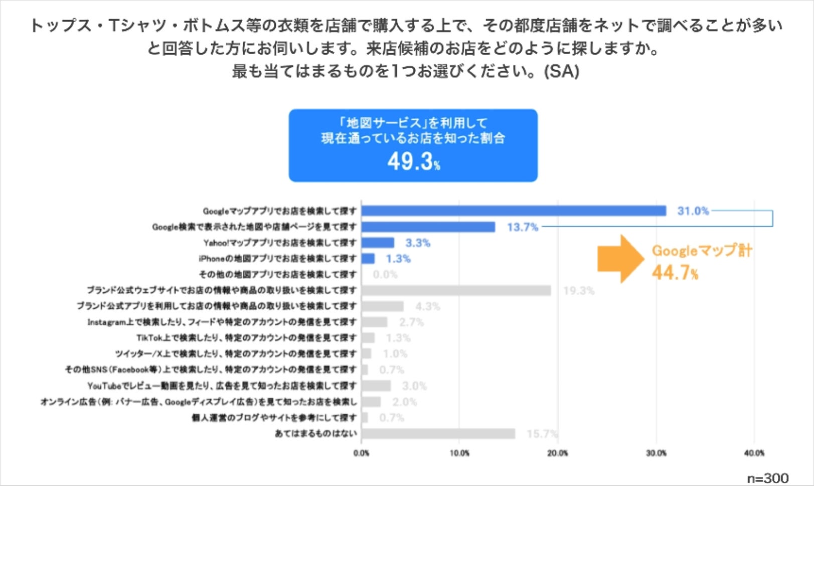衣類販売店を検索する際の手段として、「地図サービス」を利用している人は49.3%にのぼり、その中でもGoogleマップを活用している割合は44.7%と高い水準となっています。Googleマップは、衣類購入時の店舗検索における主要なツールのひとつとして広く利用されていることがわかりました。