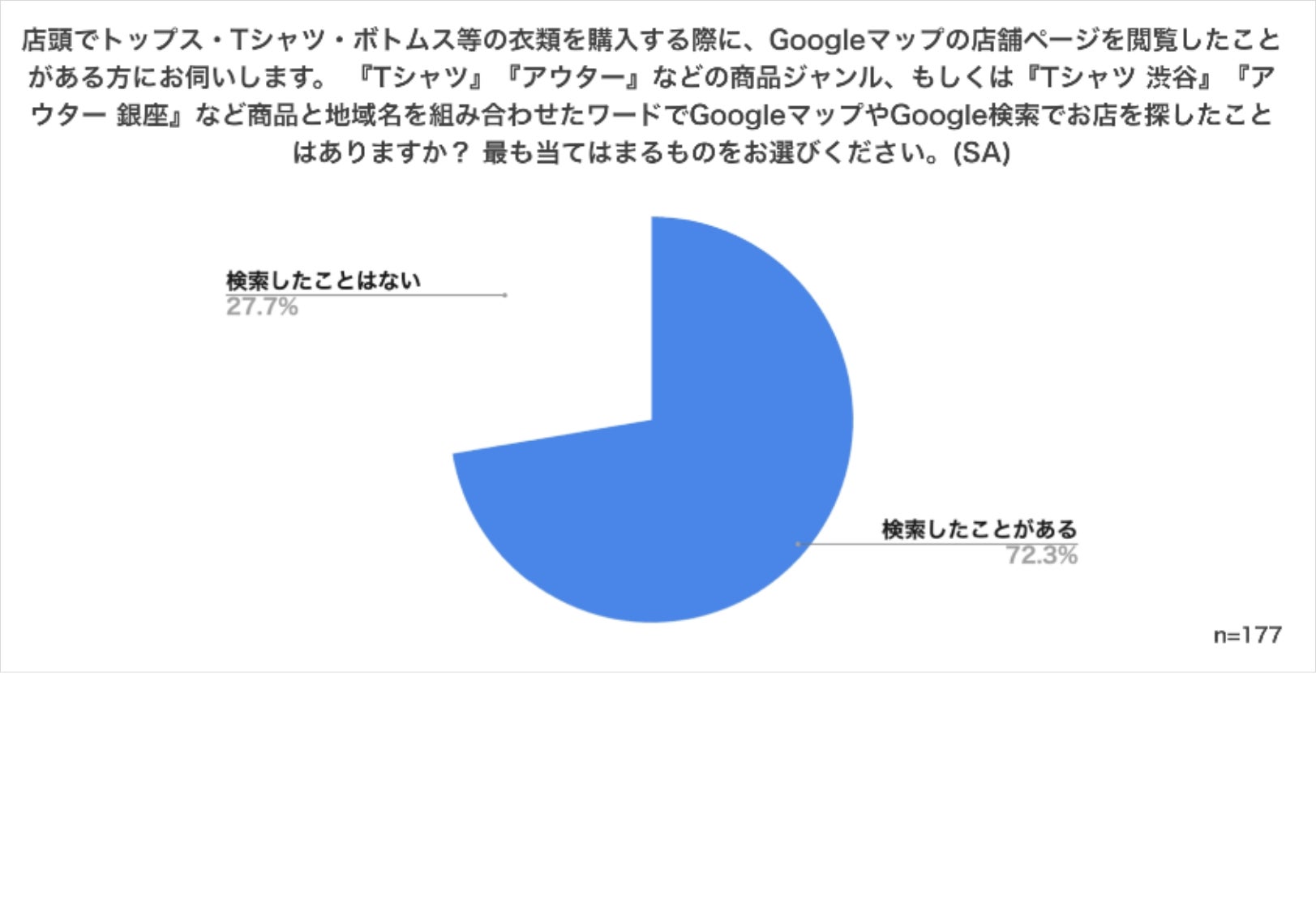 「Tシャツ」や「アウター 渋谷」など、商品ジャンルと地域名を組み合わせたキーワードでGoogleマップやGoogle検索を利用するかを調査したところ、全体の72.3%がそうした検索経験があると回答しました。