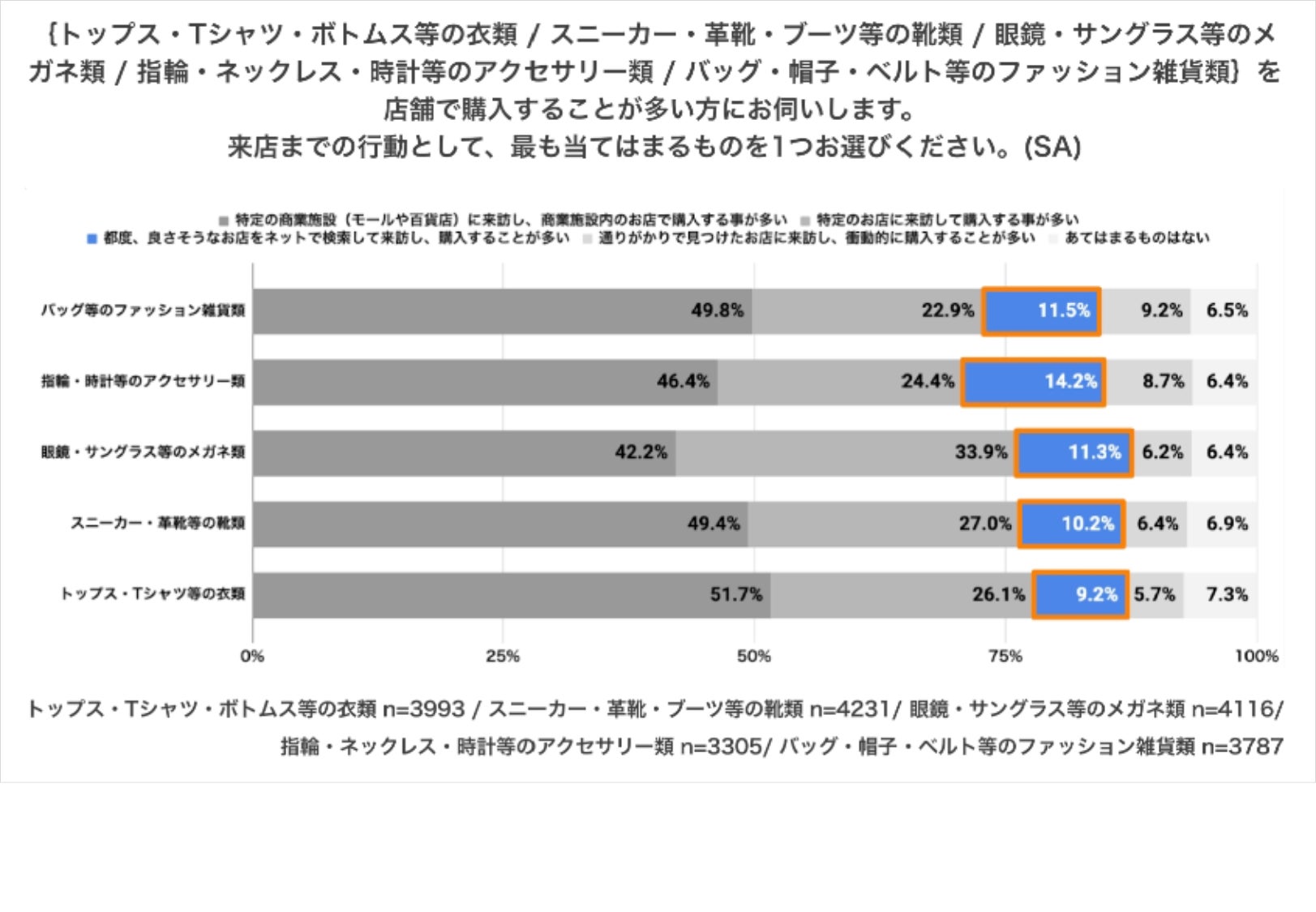 結果として、ファッション雑貨(11.5%)、アクセサリー(14.2%)、メガネ(11.3%)では「その都度検索する」傾向が一定数見られました。靴(10.2%)、衣類(9.2%)も同様に、10%割前後と消して低い数値ではありません。