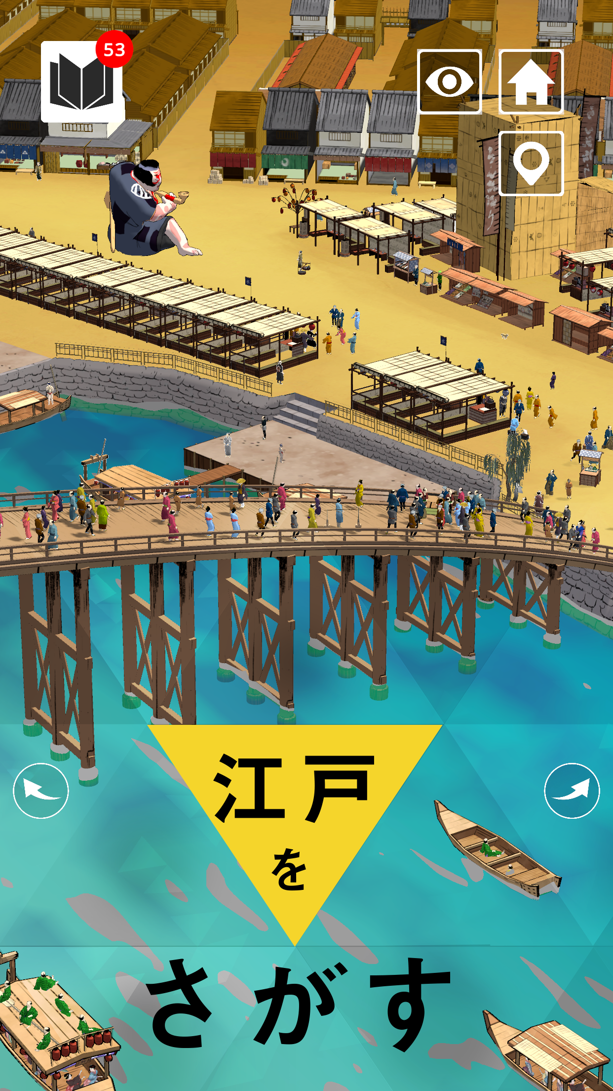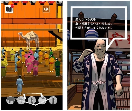 本アプリには、一人称視点による画面ビュアー機能も備わっています。浮世絵や歴史資料をもとに再現された江戸の町を、自分がまるでそこにいるかのように見回すことができます。また、町人たちがしゃべりかけてきて、アイテムを集めるヒントや散策のヒントもくれます。こうした一人称視点による機能から、今後はVRでの展開も期待することができます。