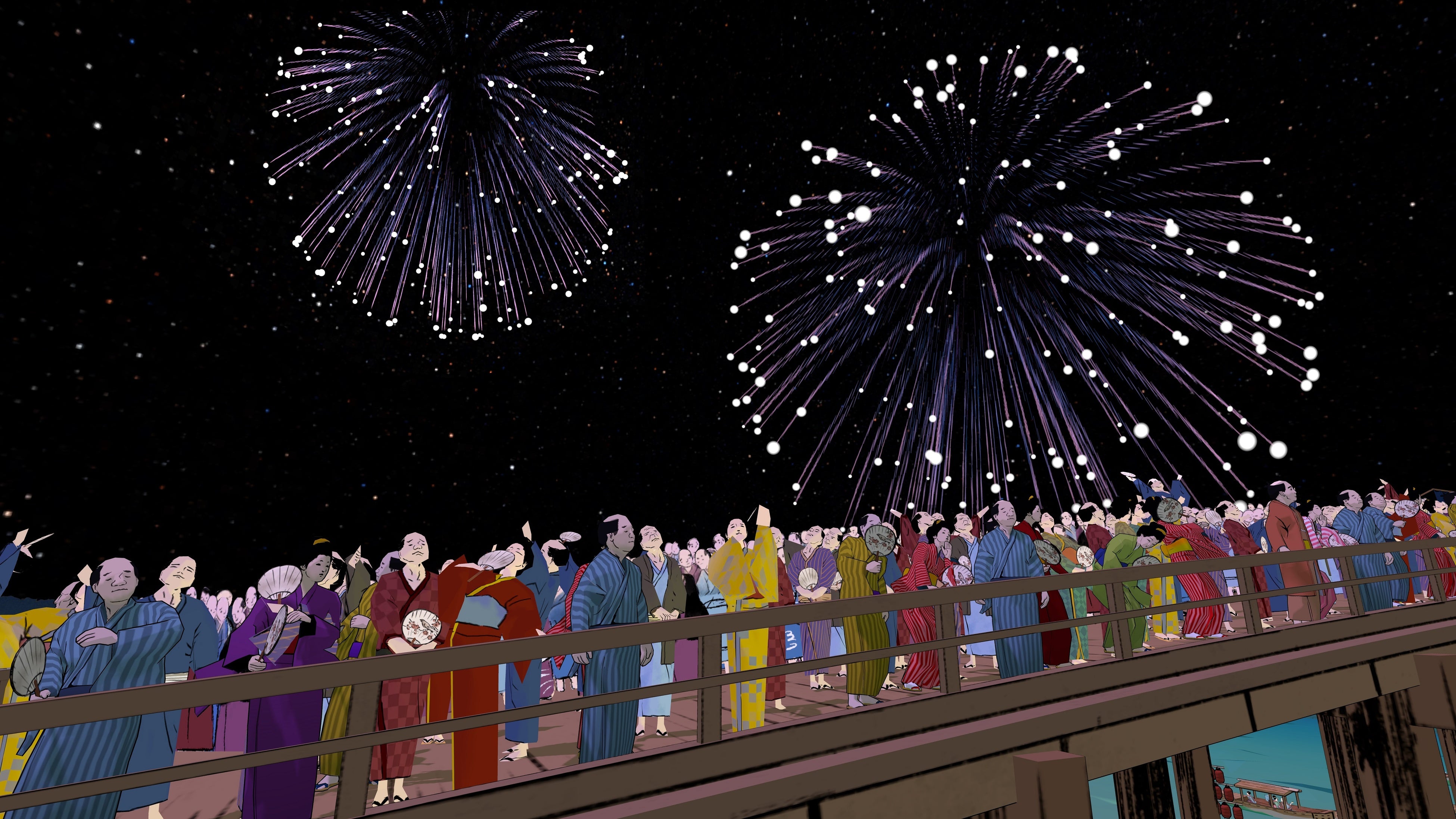 長屋からはじまる朝。ユーザーは身支度をして、江戸の町へと出発します。エリアテーマにそったアイテムをあつめると、次のエリアへ行けるようになります。最後のエリアでは隅田川に浮かぶ船での夕涼みが待っています。