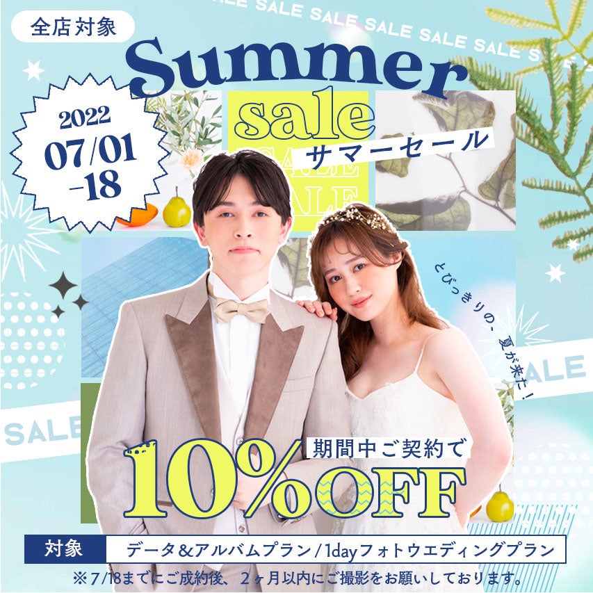 写真工房ぱれっと(有限会社 三景スタジオ)では、夏のフォトウエディングを応援する、7月1日〜7月18日までの期間中に「サマーセール」を開催いたします。結婚式する派もしない派も嬉しい、人気のプランがお得に楽しめるチャンスです!
