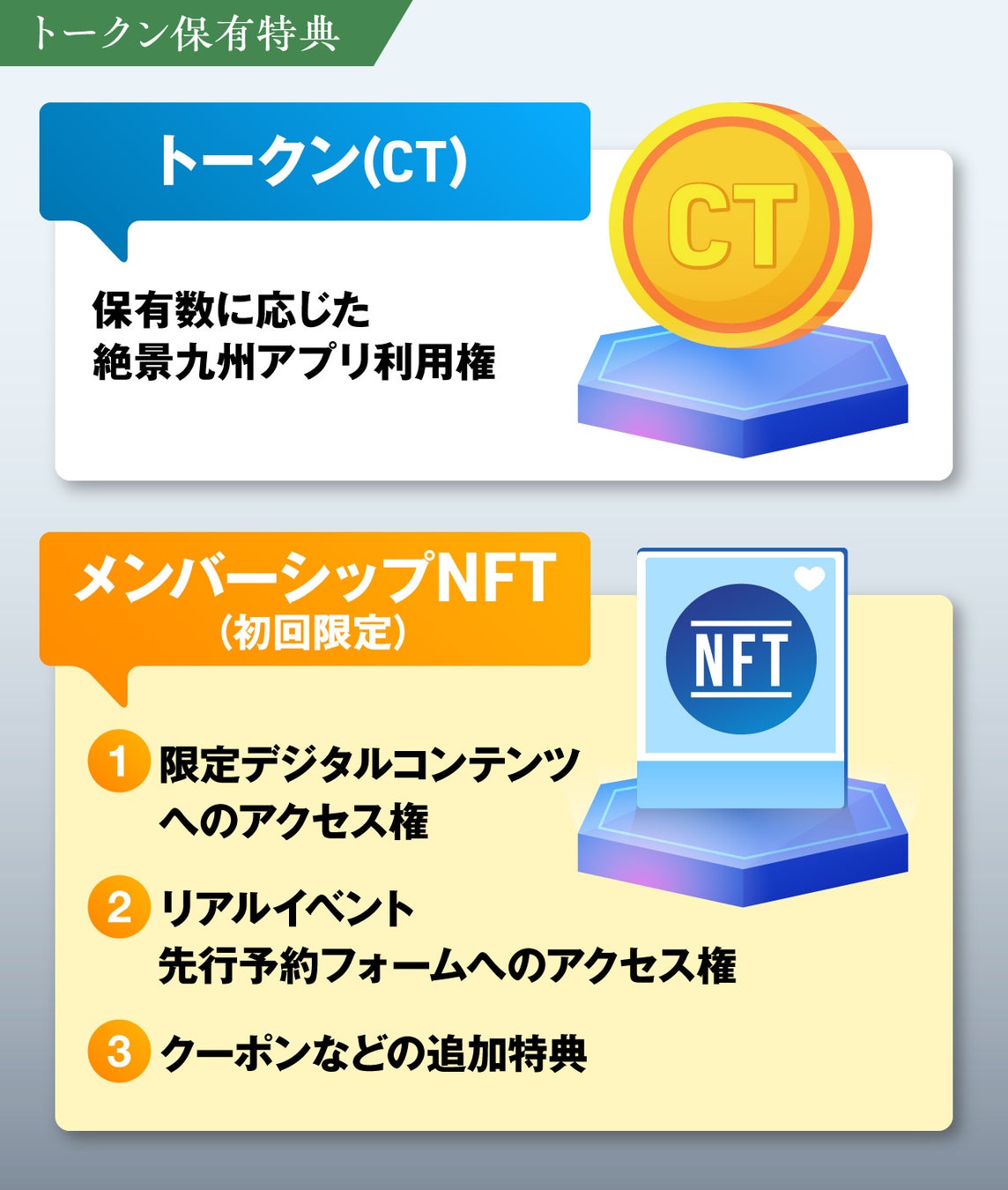 今回のトークン販売収益は、当プロジェクトの目玉コンテンツとなる「絶景九州アプリ」の開発、展覧会やツアーパッケージなどの企画運営資金として活用され、支援者(サポーター)にはトークンの保有数量に応じたアプリのアクセス権や追加特典、メンバーシップNFT保有特典などが付与されます。