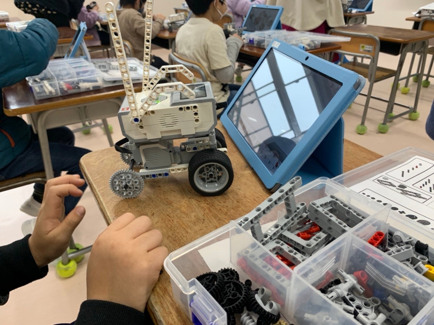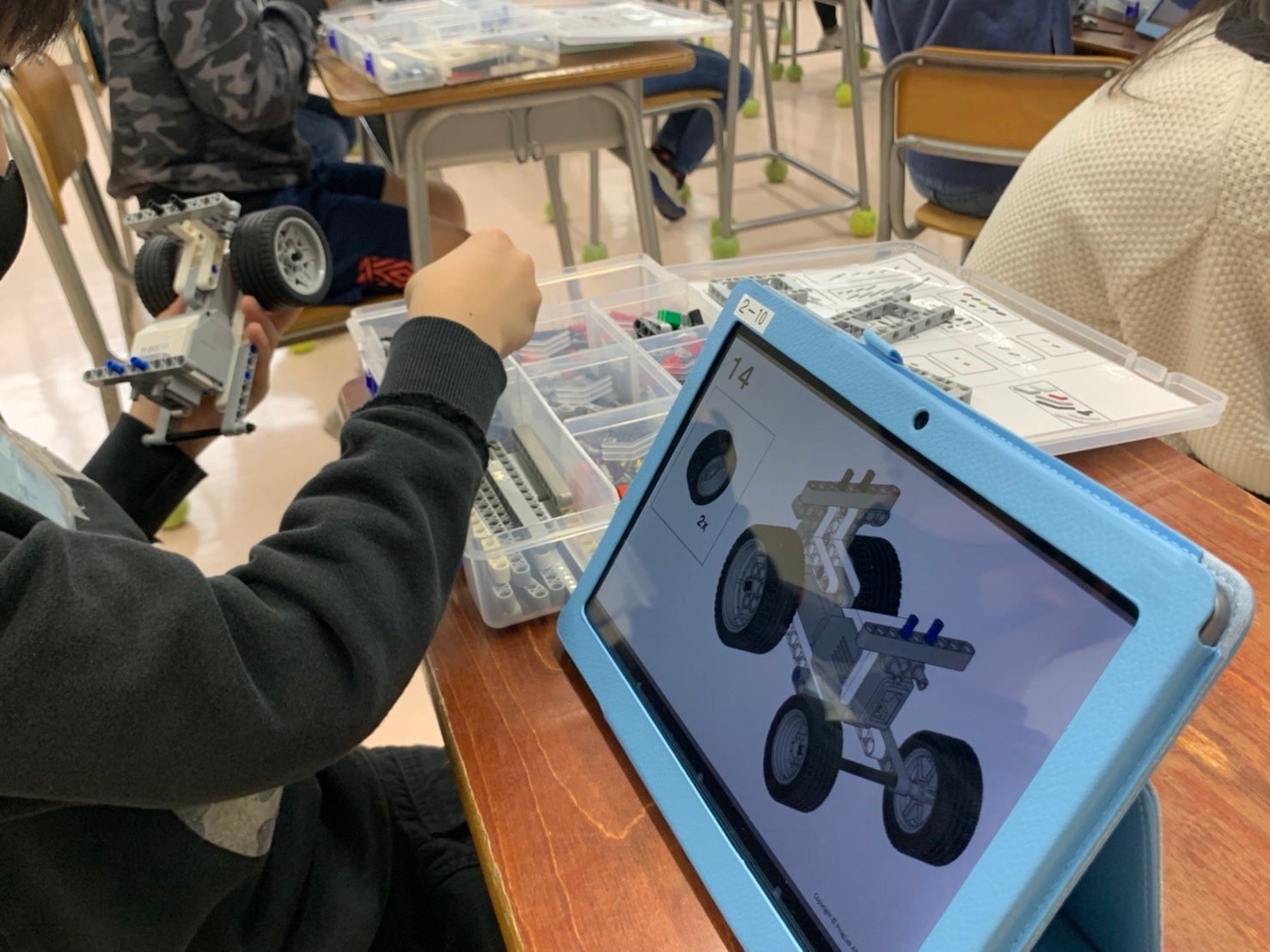 一人一台のロボットとタブレットが用意され、子どもたちはタブレットに映し出された説明書を見ながら、レゴブロックの細かいパーツを一つ一つ、つなげていきます。似たようなパーツもたくさんあり難しい作業ですが、先生のサポートを受けながら着々と組み立てていきました。