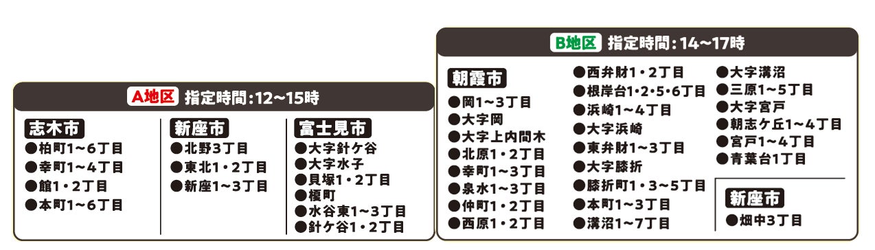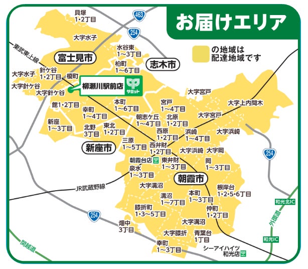 お届けエリア(埼玉県志木市、朝霞市、新座市、富士見市の以下の地域)