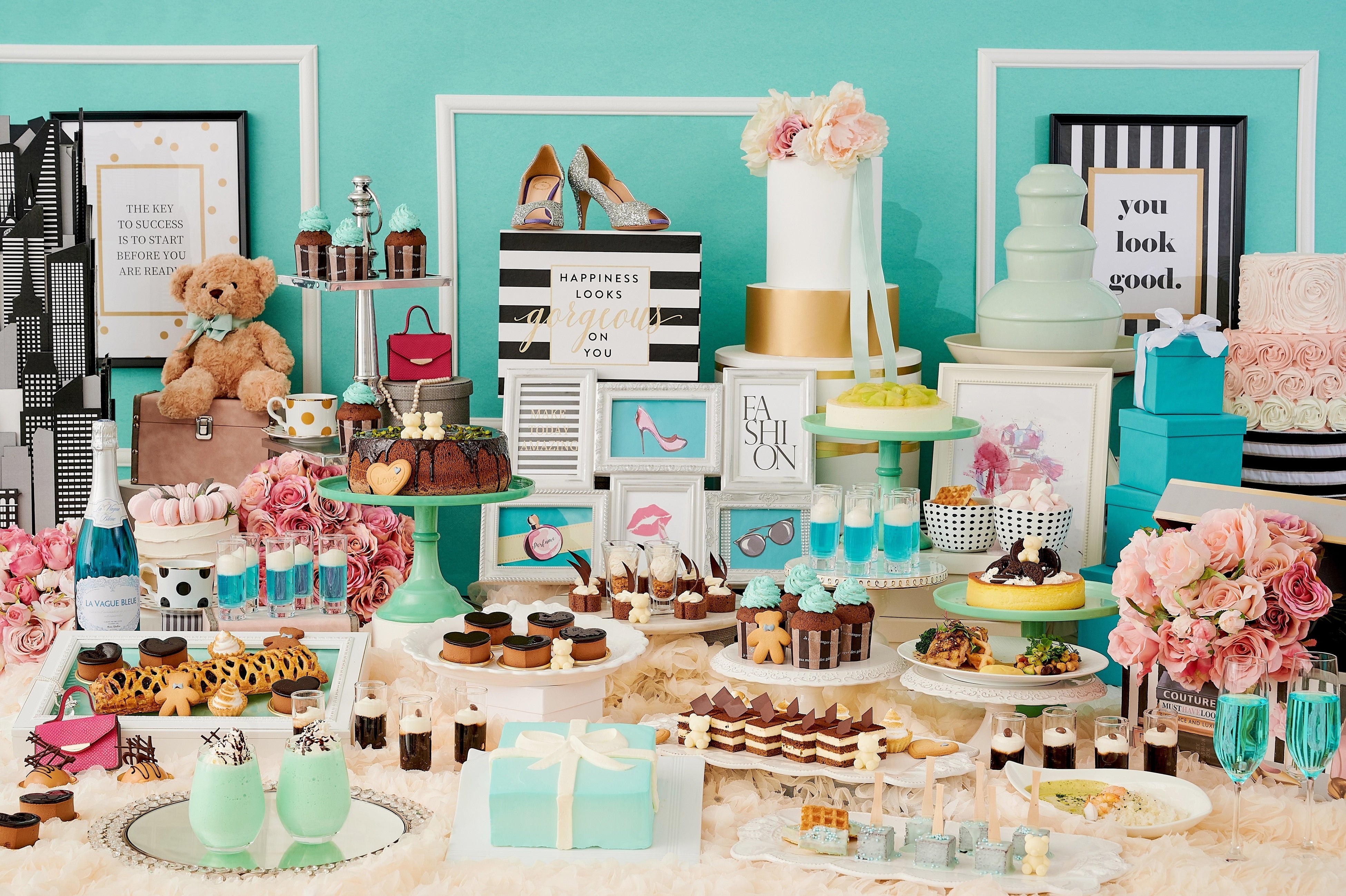 憧れの5thアベニューで見つけた宝石のように輝くメロンのレアチーズケーキや、ギフトボックスをかたどったメロンショートケーキ、見た目にも爽やかなチョコミントカップケーキなどもビュッフェボードを華やかに彩ります。