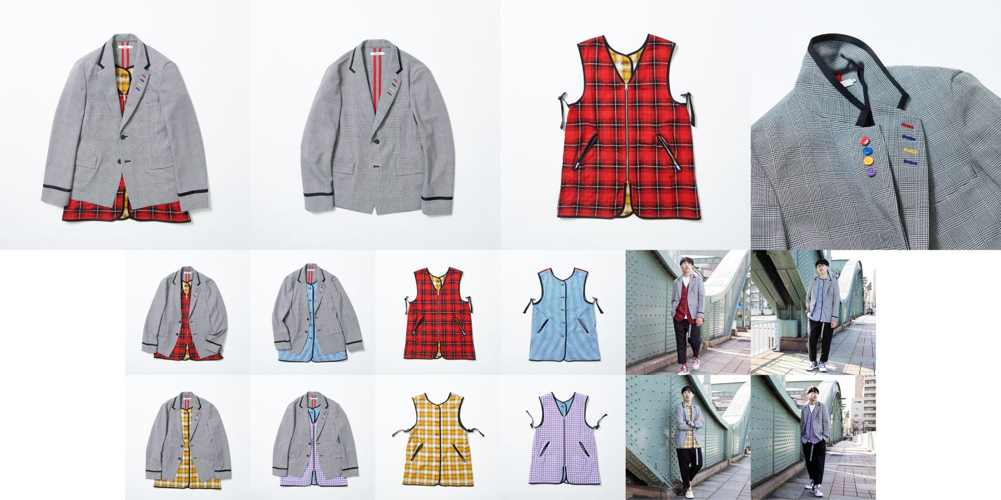 ジャケットはシックなグレンチェックのショートジャケットをベースに 電車の車掌のユニフォームからインスピレーションを得たブラックテープをカラー・袖に施しています。