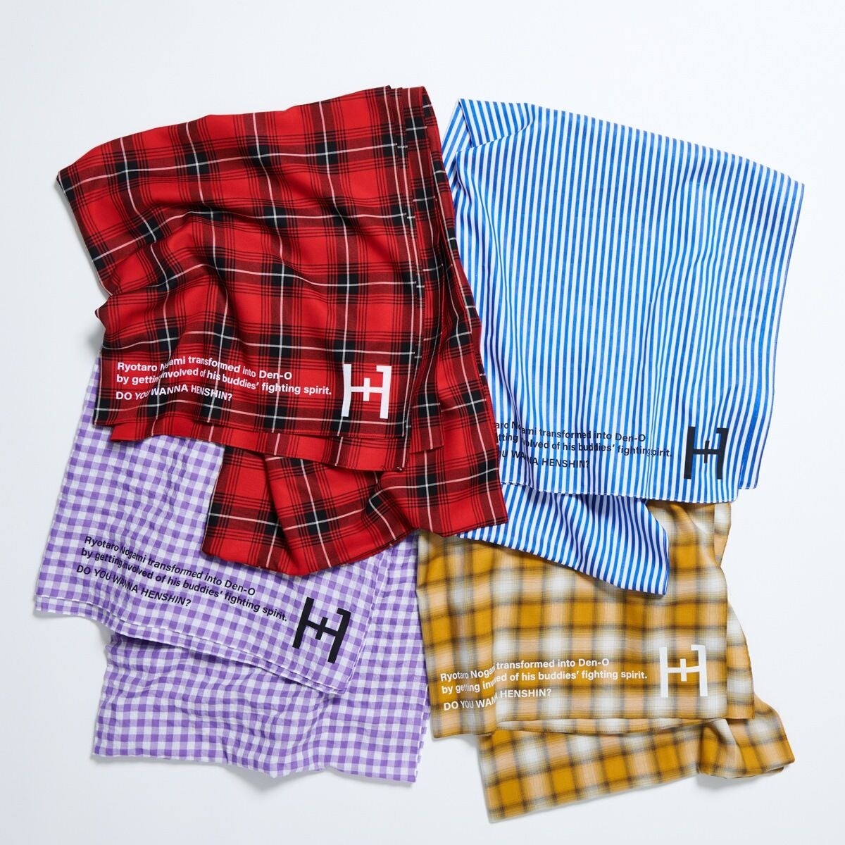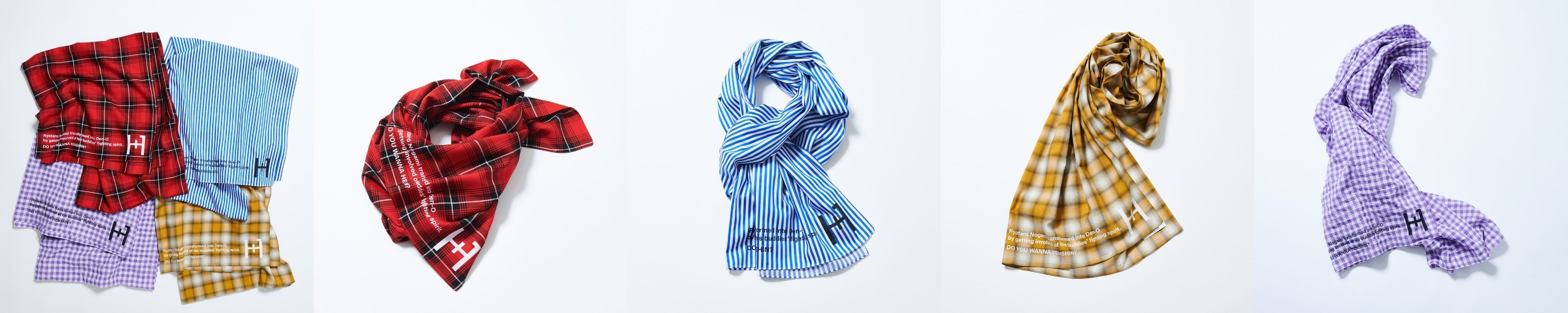 それぞれのストールにプリントした野上良太郎が変身した理由のテキストがアクセントに。