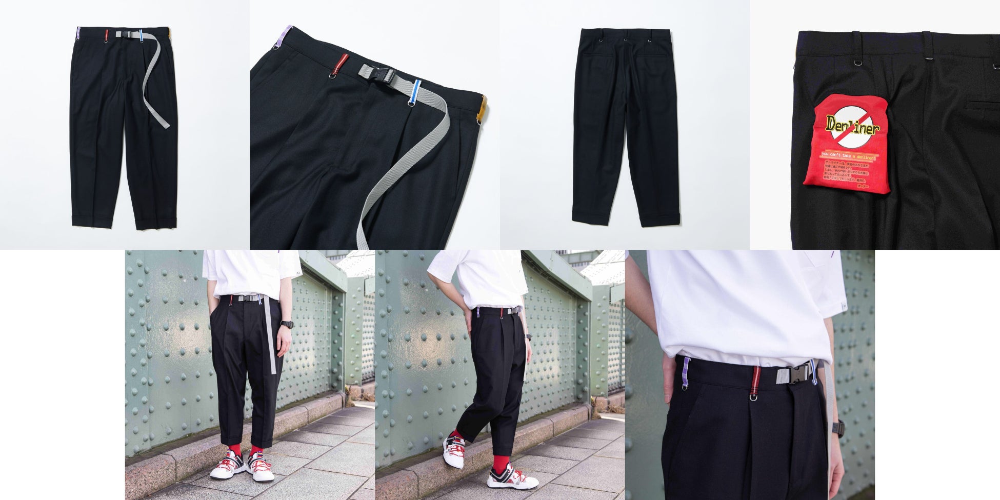 さりげなくあしらわれた4色のテープがイマジンを表現し、仮面ライダー電王のイメージをファッションの観点から表しています。