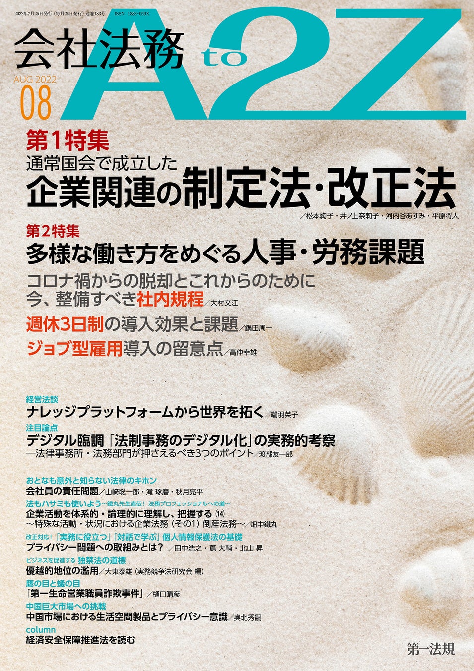 法律関連出版物、各種データベースを提供する第一法規株式会社(所在地:東京都港区、代表取締役社長:田中 英弥)は『会社法務A2Z 2022年8月号』を発刊中です。