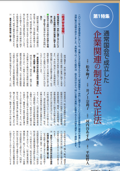 2022年の通常国会では、企業に大きな影響をもたらす「経済施策を一体的に構ずることによる安全保障の確保の推進に関する法律」等の法律が成立しました。本特集では、これら制定法・改正法の中から、企業に影響を与える法律を概説しています。