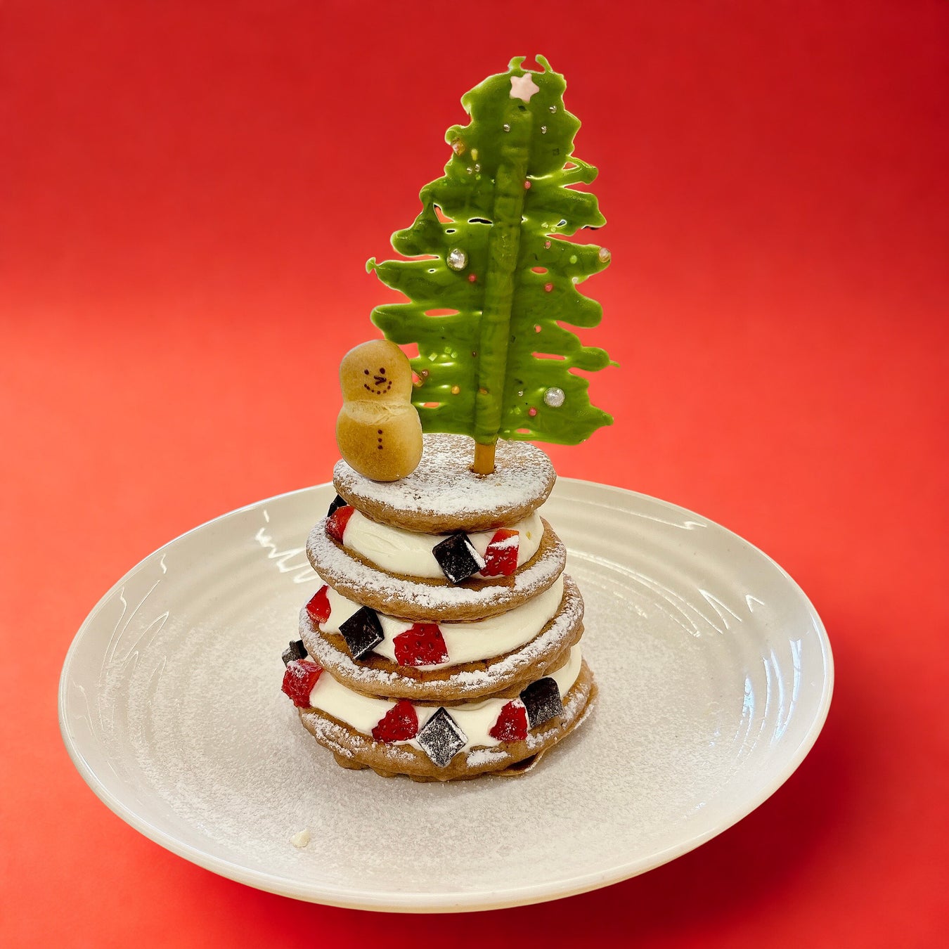 ご注文を受けてから焼き上げるぱんケーキに、とろけるクリームとホワイトチョコレートをトッピング。クリスマスツリーを模した、クリームで出来たミニツリーと、優しい甘さのパン生地で出来た雪だるまもポイントです。