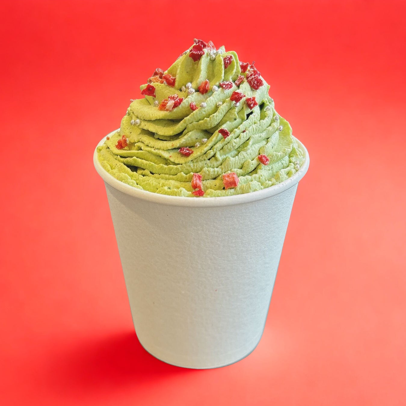 ピスタチオクリームとドライいちごをトッピングした、まるでクリスマスツリーのようなオリジナルラテです。