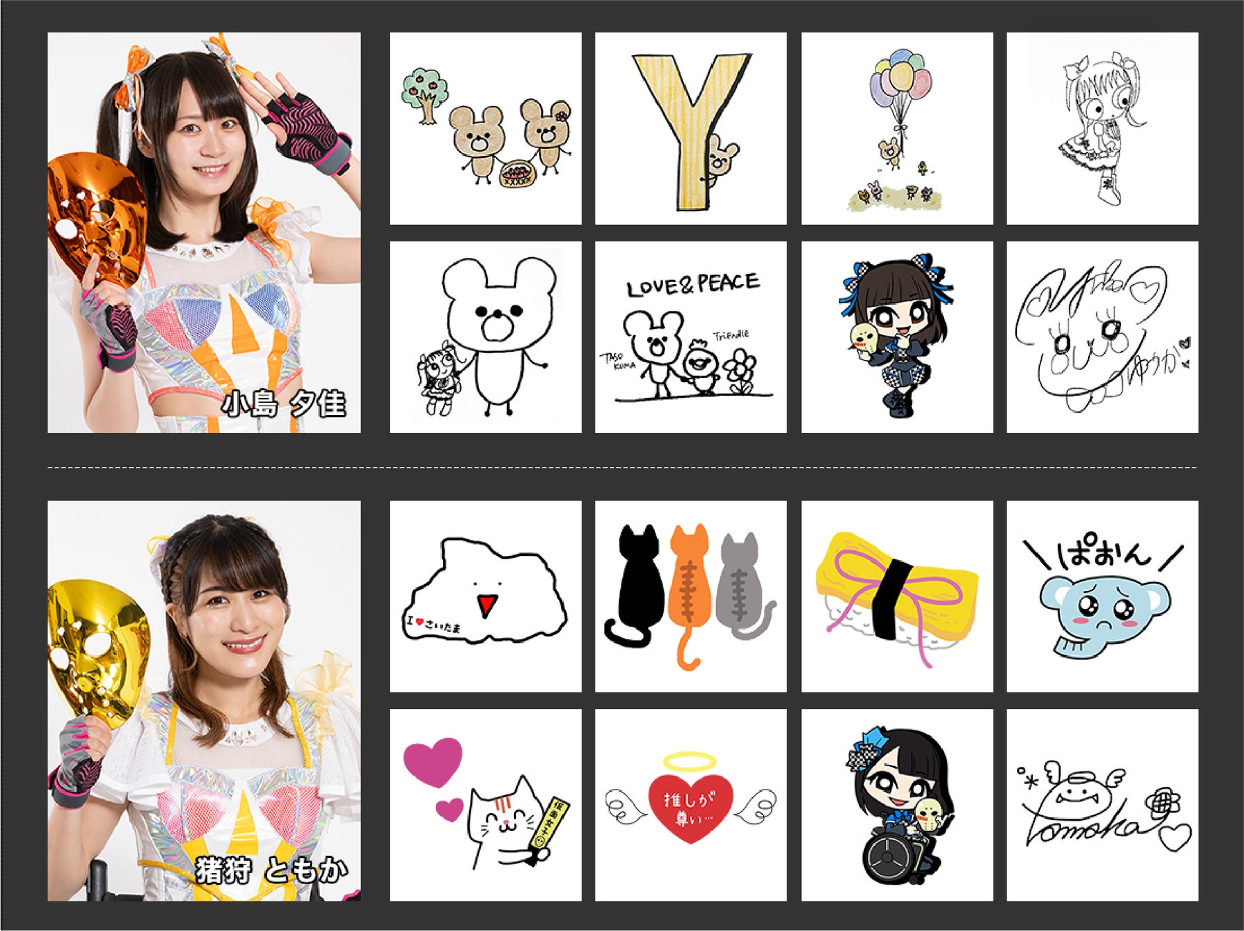 仮面女子のメンバー7名による描き下ろしイラストを含む60種類を超えるスタンプが使い放題。自由にデザインをしてあなただけのオリジナルデザイングッズが作成できます。