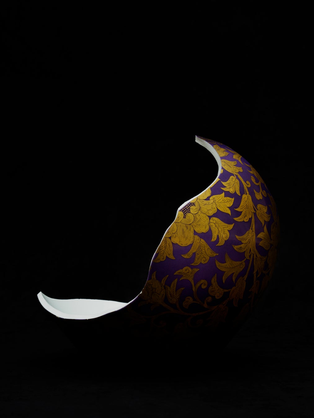 本展覧会では、2024年元日に発生した能登半島地震で被災した九谷焼窯元 「錦山窯」 の名作を、写真家・蓮井幹生が1億画素の超高精細カメラで撮影した写真作品を展示。割れ、欠け、崩れた九谷焼の姿を、破壊の中に生まれる新たな美として捉えた作品群が並びます。作品の撮影にあたっては、背景を漆黒に統一し、損壊のディテールを際立たせることで、陶器が持つ繊細な質感と、時間や自然災害が刻んだ痕跡を鮮明に可視化。単なる記録を超え、人間と自然、人間と物質の拮抗関係、再生への希望を宿したヴィジュアルへと昇華させています。