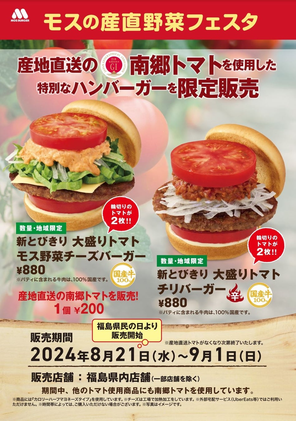 期間中は、同組合の産地直送の南郷トマトを使用した数量・地域限定商品「新とびきり 大盛りトマト モス野菜チーズバーガー」と「新とびきり 大盛りトマト チリバーガー」を販売します。福島県南会津郡南会津町の「JA会津よつば南郷トマト生産組合」産地直送のトマトを使った、この期間だけのジューシーでボリュームたっぷりのハンバーガーを、ぜひお召し上がりください。モスバーガーでは、今年3月下旬から新定番商品として、国産牛100%使用のパティ※1を使用した“新とびきり”シリーズを新発売しました。この“新とびきり”のパティを使用した同商品は、「モスの産直野菜フェスタ」販売用として新たに開発したもので、福島県では初めて販売します。