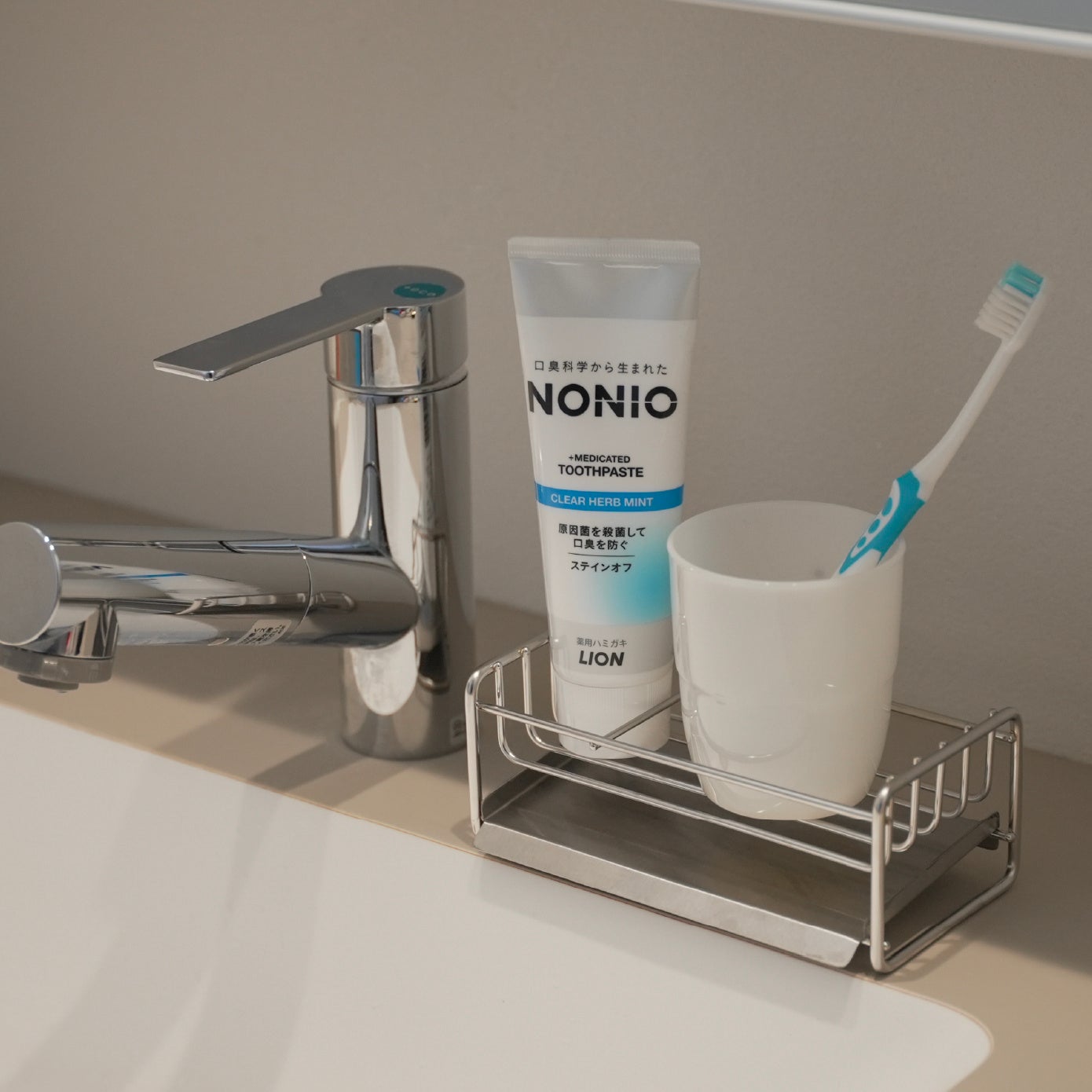 キッチンはもちろん、洗面台まわりでハンドソープや歯磨きセットを置くラックとしても活用できます。