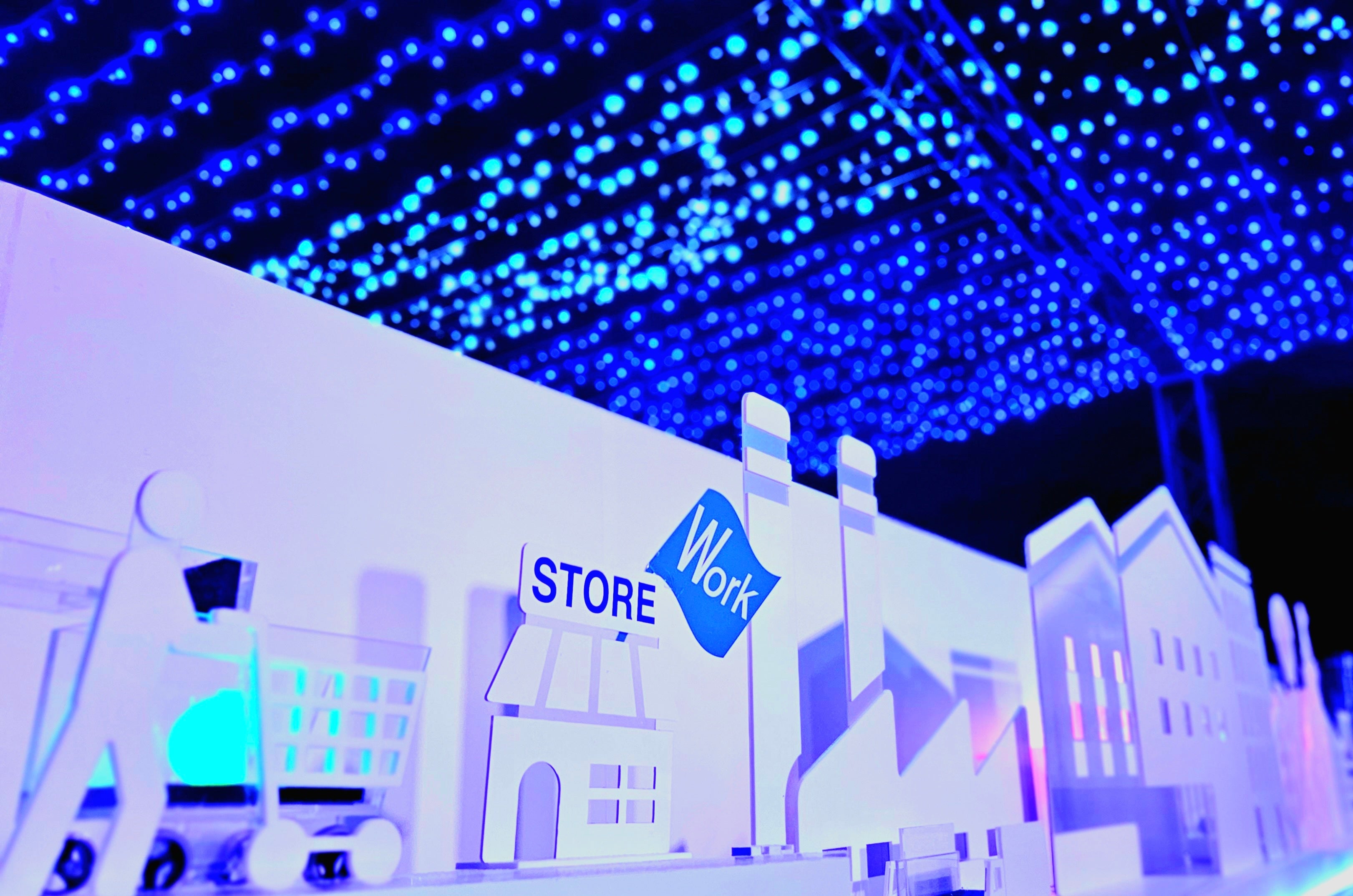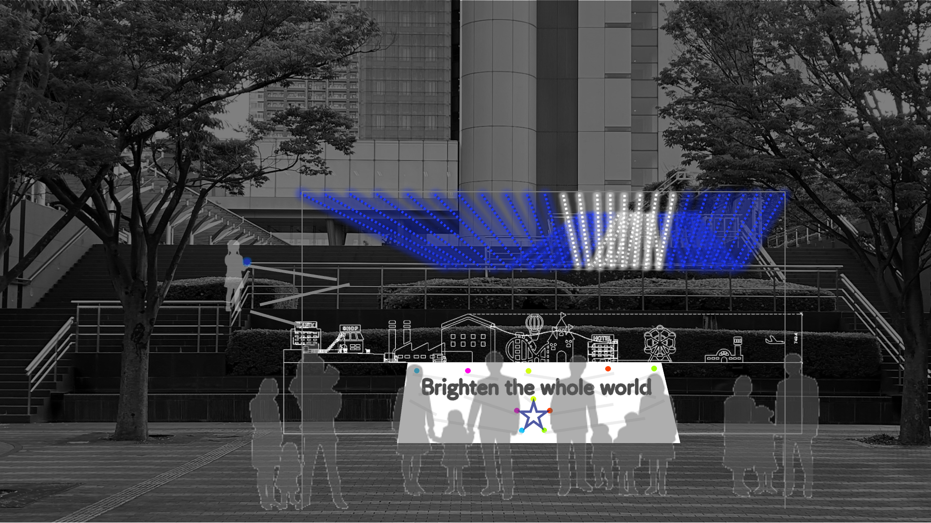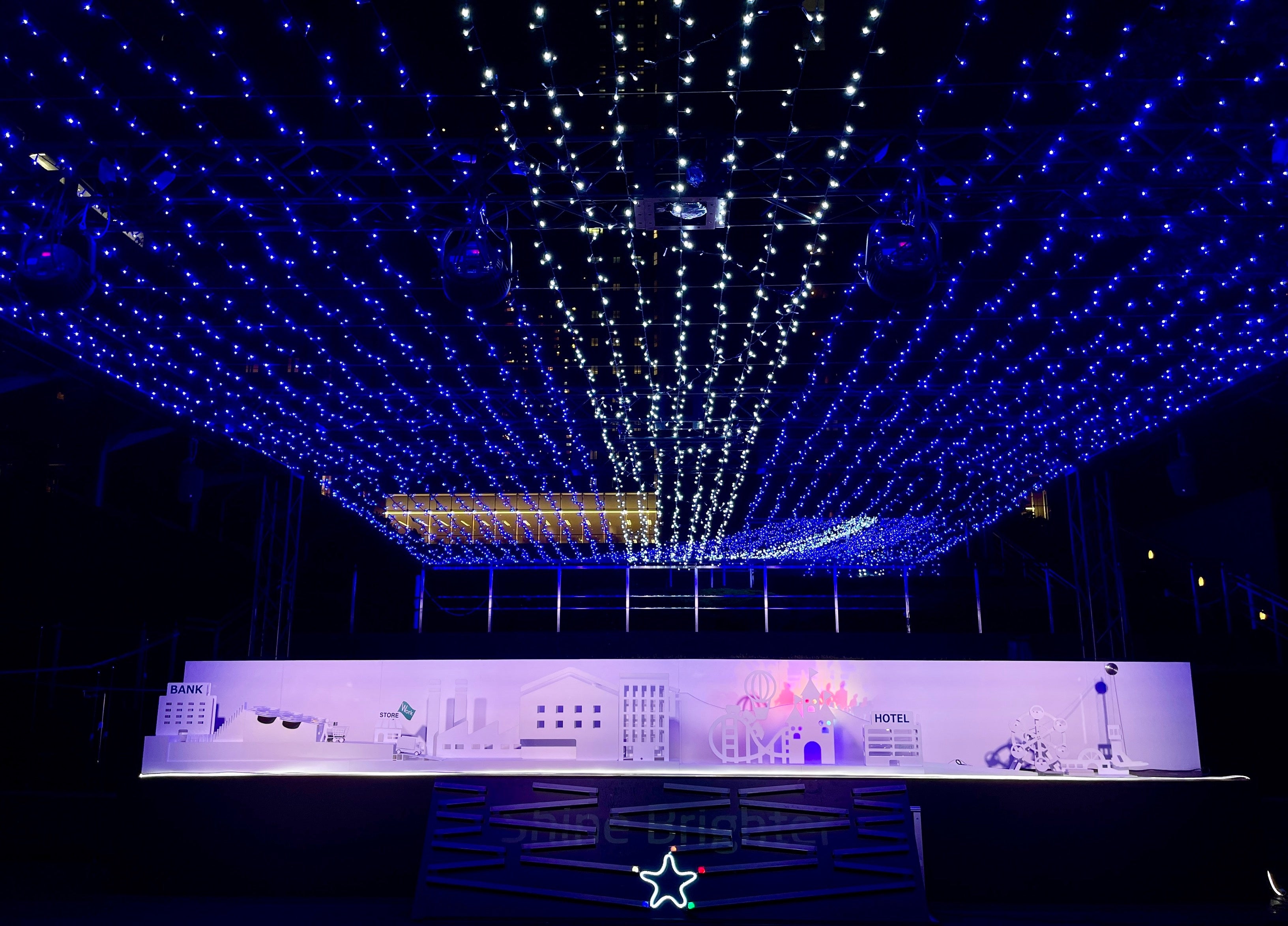 NECのエンタープライズ事業領域である銀行、店舗 、工場、空港、ホテル等を模した巨大からくり装置では、NECが人や生活の繋がり、止まらない社会の実現に向けて取り組んでいることをエモーショナルに表現しました。また、そこに広がる無数の星を表現した大規模なイルミネーションは、NECが皆さまと共に創っていく「街」の輝きや灯りをイメージし、NECのソリューションで、もっと、街を明るく、社会により煌めきを生み出していくという思いを込めました。