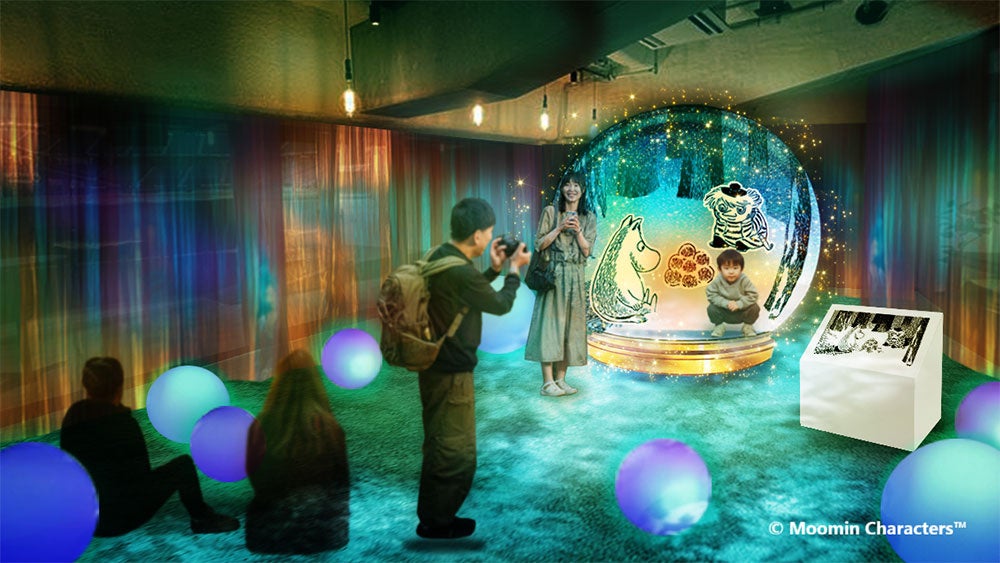 「ムーミン谷の冬」はムーミンがはじめて見る雪の世界。森の中でオーロラを眺めながら、ムーミンの世界の物語との出会いの時間を過ごすことができる。冬眠から目覚めたムーミンが林の中でトゥーティッキと出会う物語のスノードームのパネルで一緒に写真をとろう。