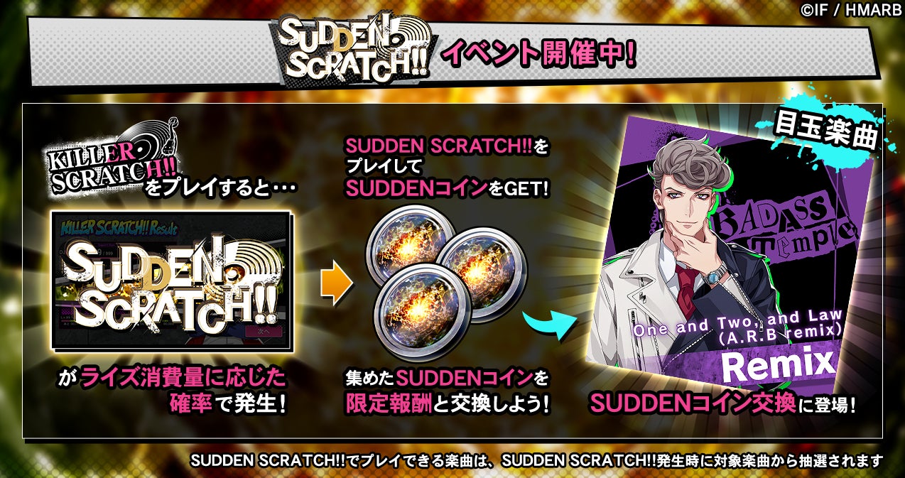 イベント期間中、KILLER SCRATCH!!をプレイするとライズ消費量に応じた確率でSUDDEN SCRATCH!!が発生します。SUDDEN SCRATCH!!をプレイすると、通常の報酬アイテムの他、限定アイテム「SUDDENコイン」を獲得することができます。「SUDDENコイン」を集めることで、新楽曲「One and Two, and Law(A.R.B remix)」と交換することが可能です。詳細はアプリ内お知らせをご確認ください。