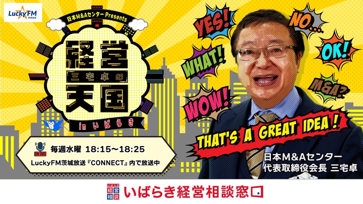 「いばらき経営相談窓口」の開設に合わせ、4月3日(水)からLuckyFM茨城放送「CONNECT」内にて、新コーナー「日本M&Aセンター Presents 三宅卓の経営天国 in いばらき」の提供を開始いたします。日本M&Aセンター 代表取締役会長の三宅が、茨城県内企業の経営者との対談を通じて、成功する経営の秘訣やヒントをご紹介します。