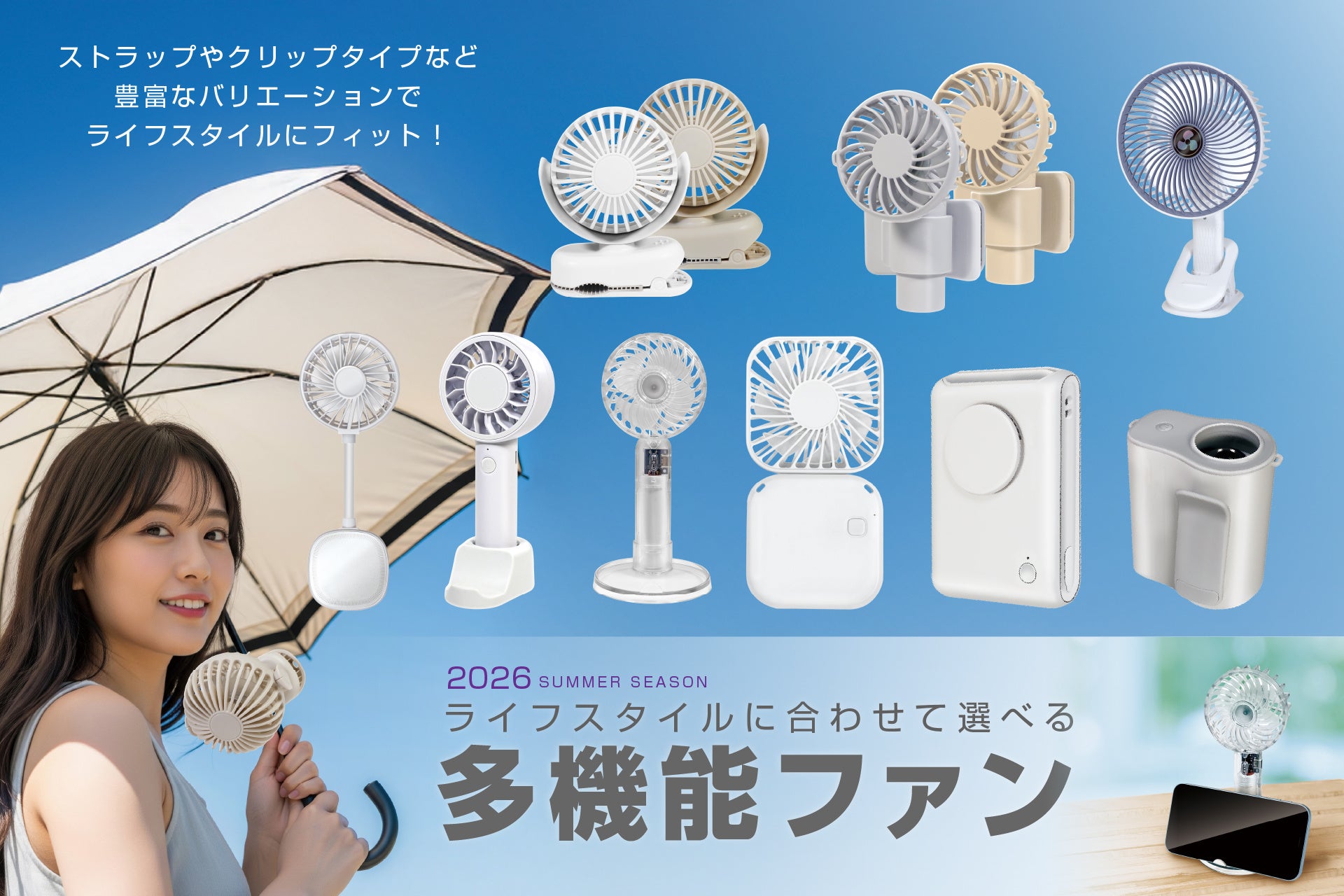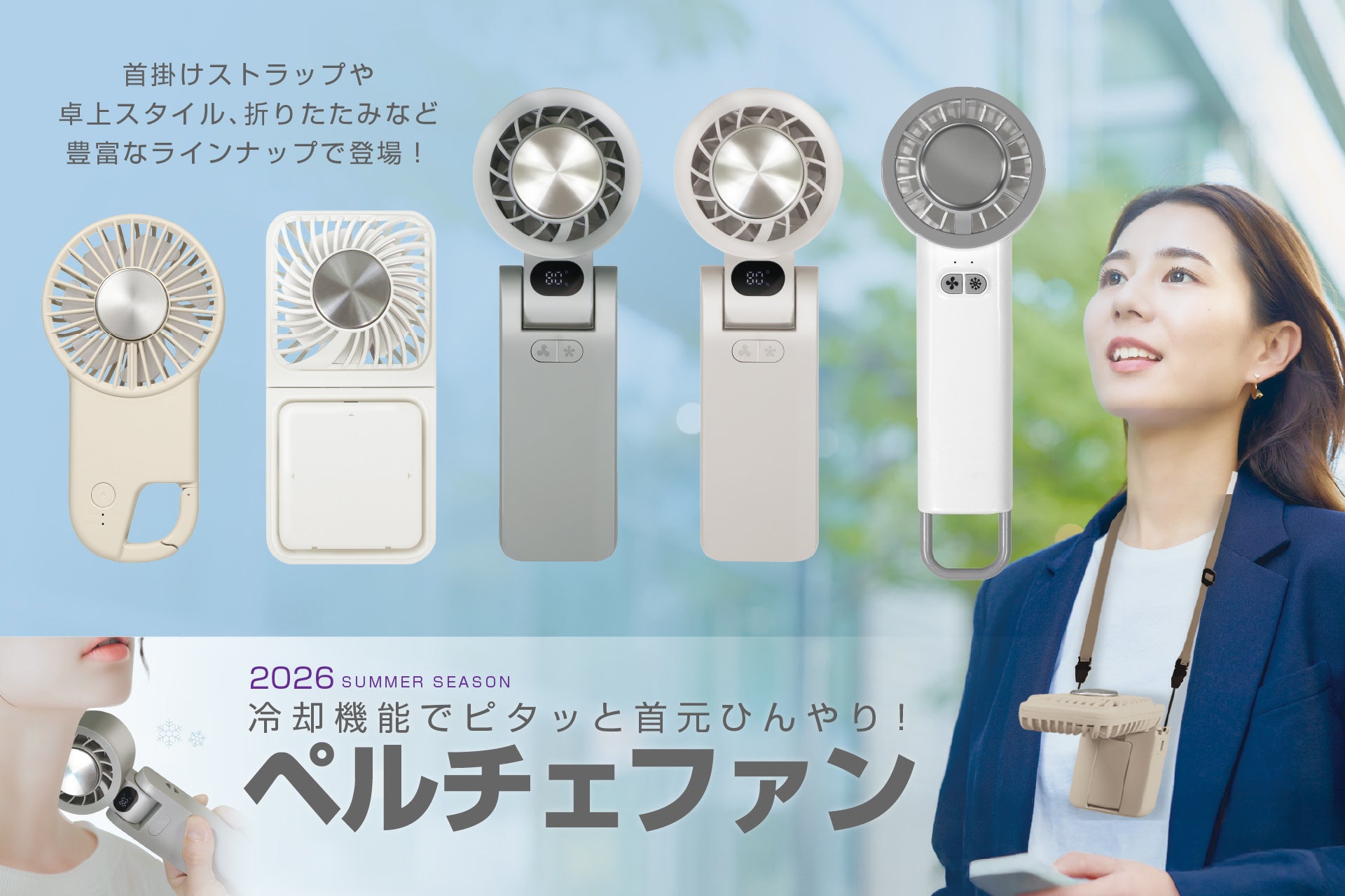 冷却機能でピタッと首元を冷やせる「ペルチェファン」首掛けストラップや、卓上スタイル、コンパクトな折りたたみみ式など、豊富なラインナップで登場。ぴったりの"相棒"を見つけて、早めの夏支度を!