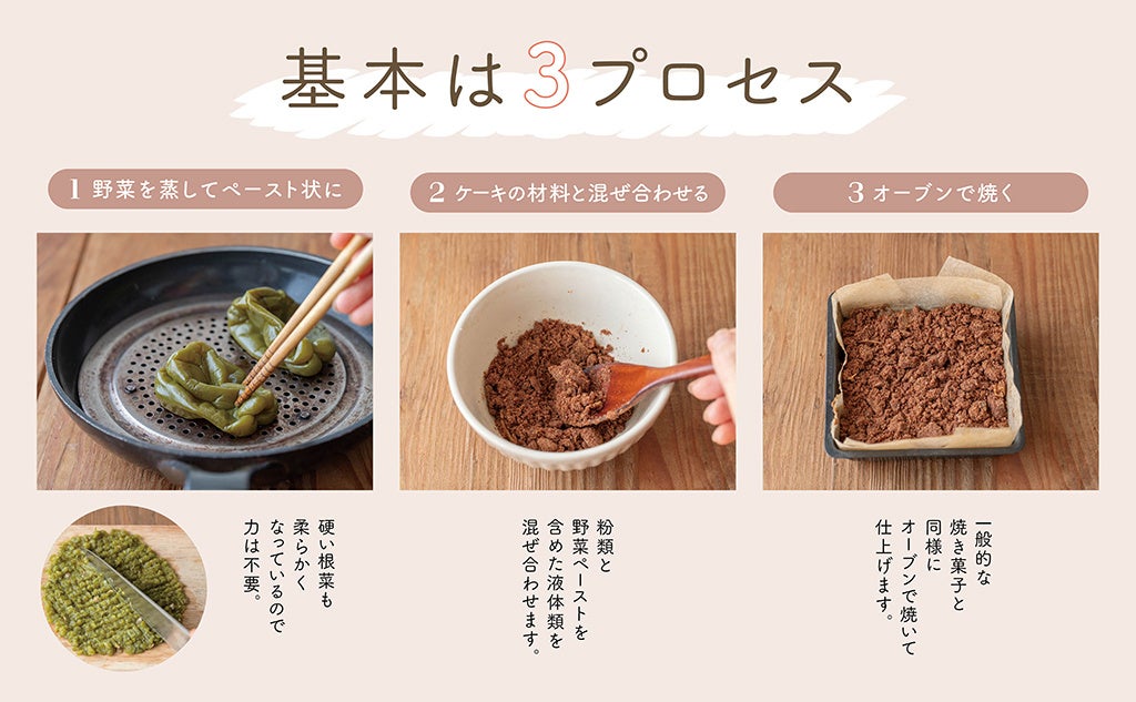 基本は「野菜をペーストにする→ケーキの材料と混ぜる→焼く」の3プロセス