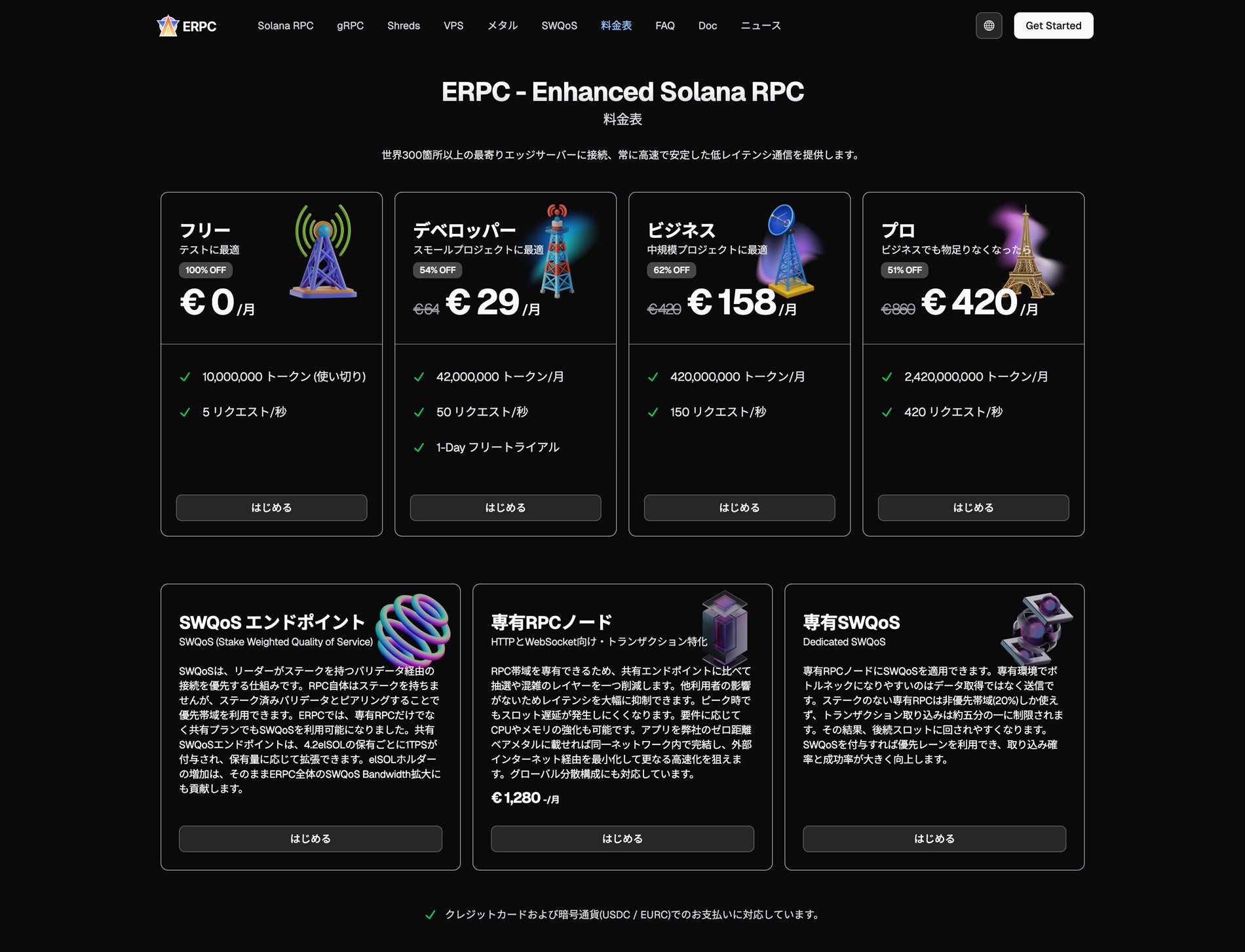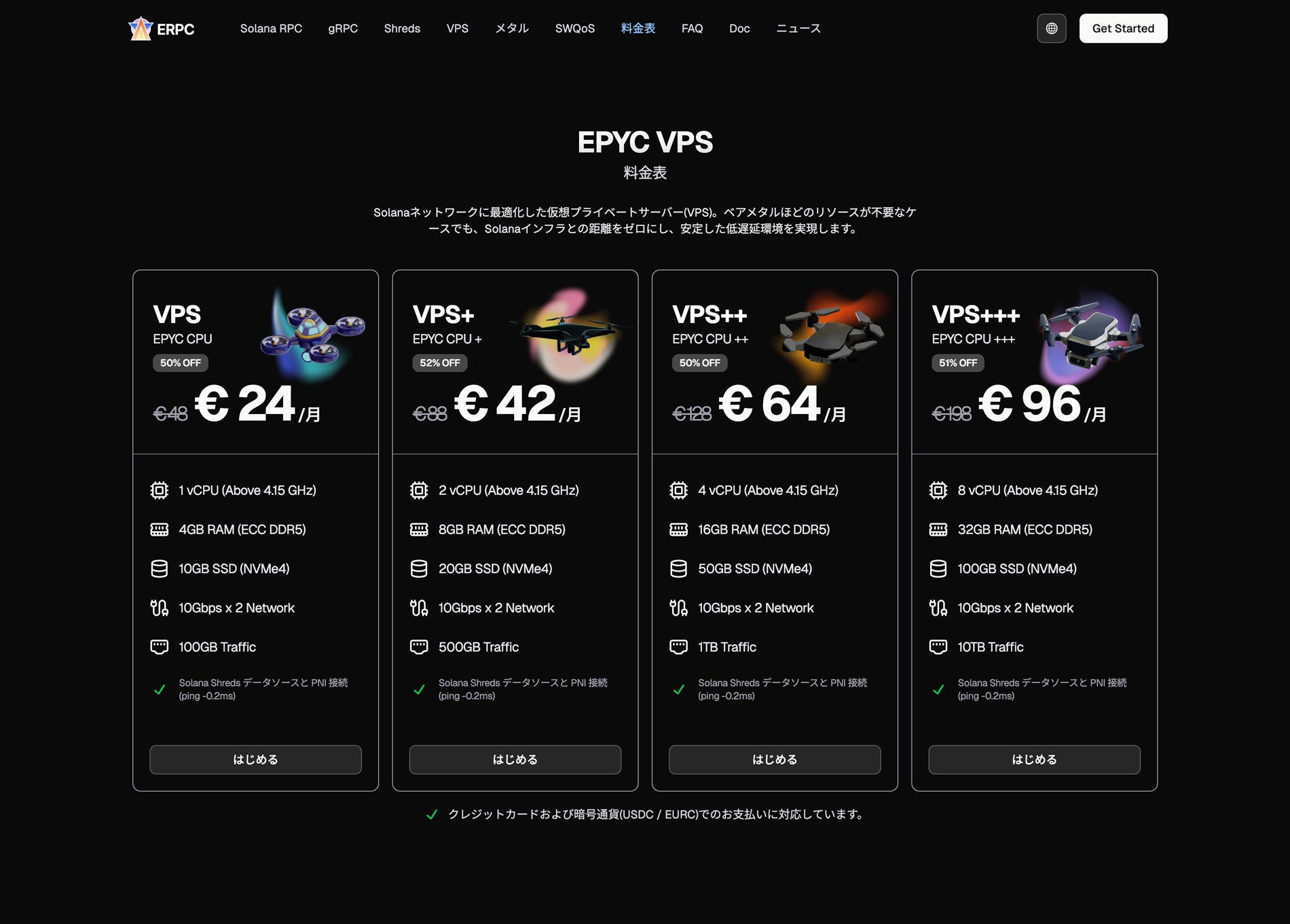 共有 Solana RPC、Unlimited エンドポイント、VPS については、それぞれ以下の料金表をご参照ください。