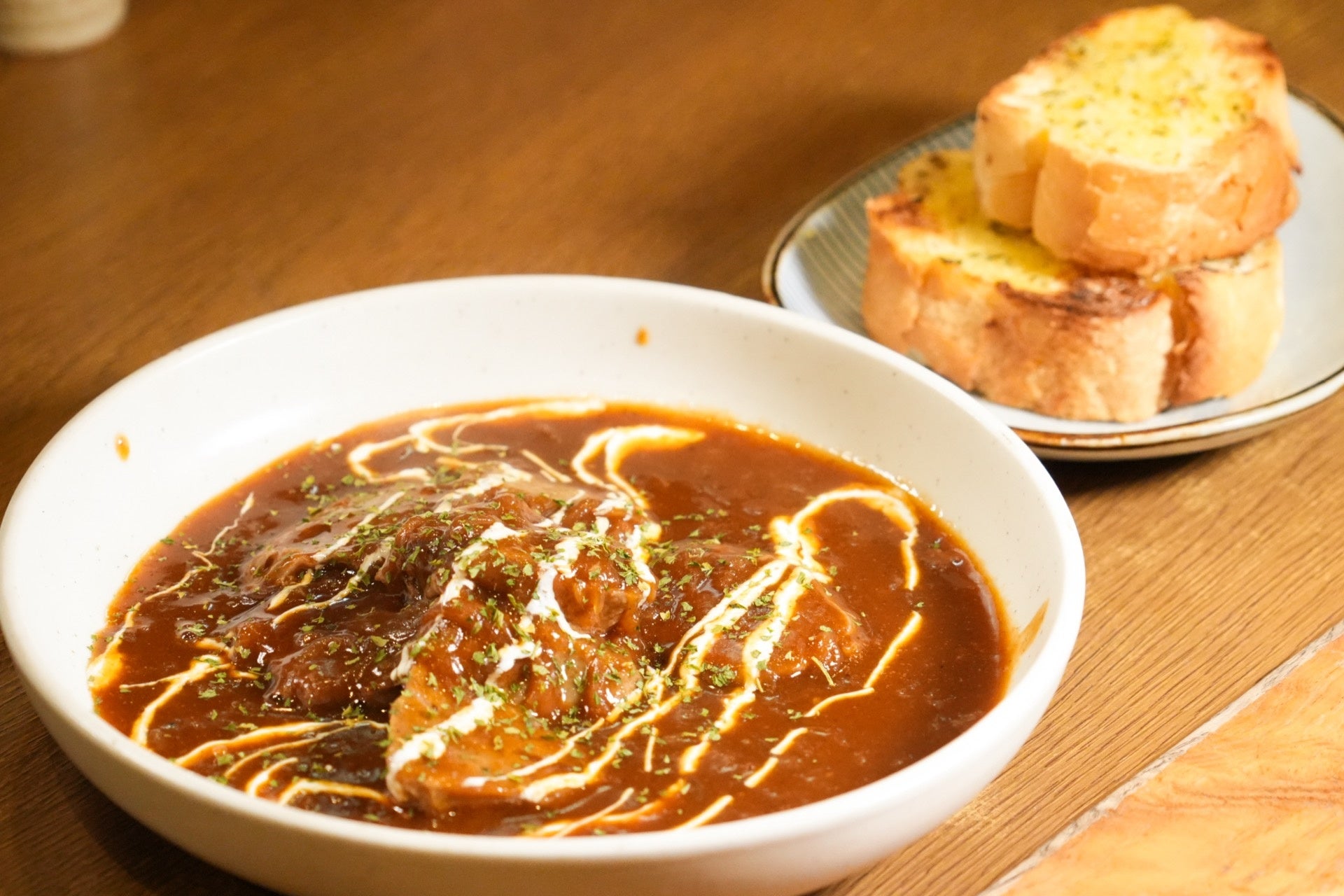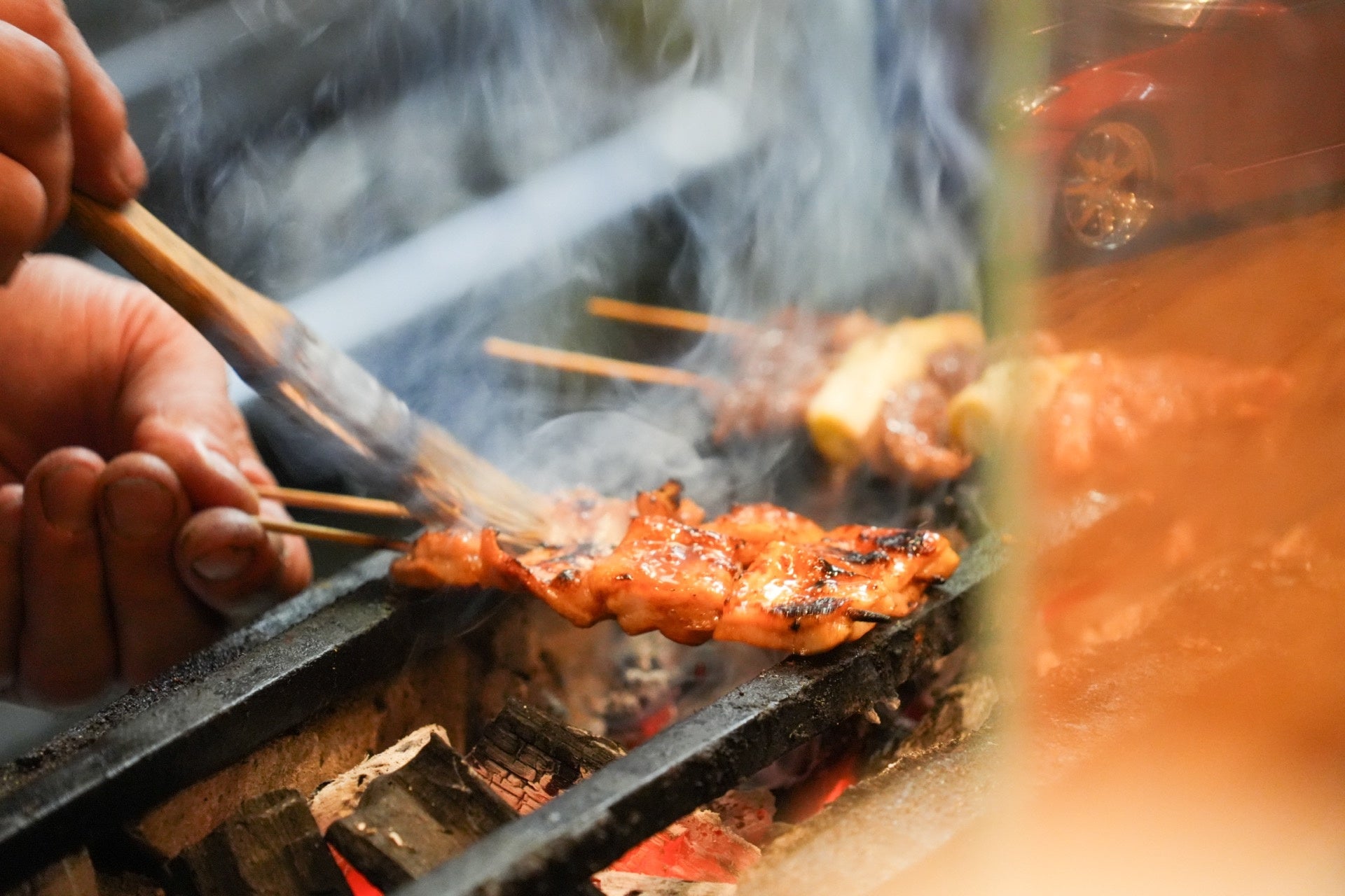 ナスのお通しとともにまずは生ビールを一杯。師匠から受け継いだタレの焼き鳥、珍しい豚のタンシチューには赤ワインを。「みんなが集まる暖かい場所を作りたい」という思いで営む店主の人柄と、確かな目利きと腕で作られる品々に魅了された常連で賑わう店内。駅前の繁華街とは違った暖かさに感じ入る。