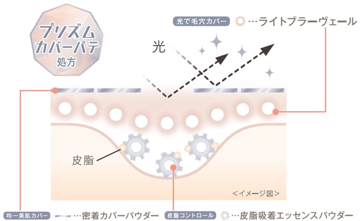 光を拡散するパウダーがヴェールを形成して毛穴の凹凸を厚塗り感なくカバーする『ライトブラーヴェール*5』、美肌エキス(ノイバラ果実エキス/整肌成分)を抱えたパウダーが余分な皮脂を吸着する『皮脂吸着エッセンスパウダー*6』で、1日中毛穴崩れをブロック。
