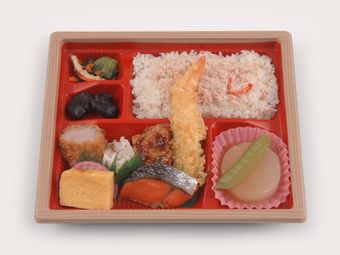 ■商品特徴 :かにの風味豊かなかにめしと大根煮、海老天、紅鮭、ヒレカツ、黒豆煮、鶏照焼、焼売、厚焼玉子等、いろいろなおかずを組み合わせたうれしい和風御膳です。あっさりしたおかずが中心ながらも、見た目も鮮やか、食べ応えも十分のお弁当に仕上げました。
