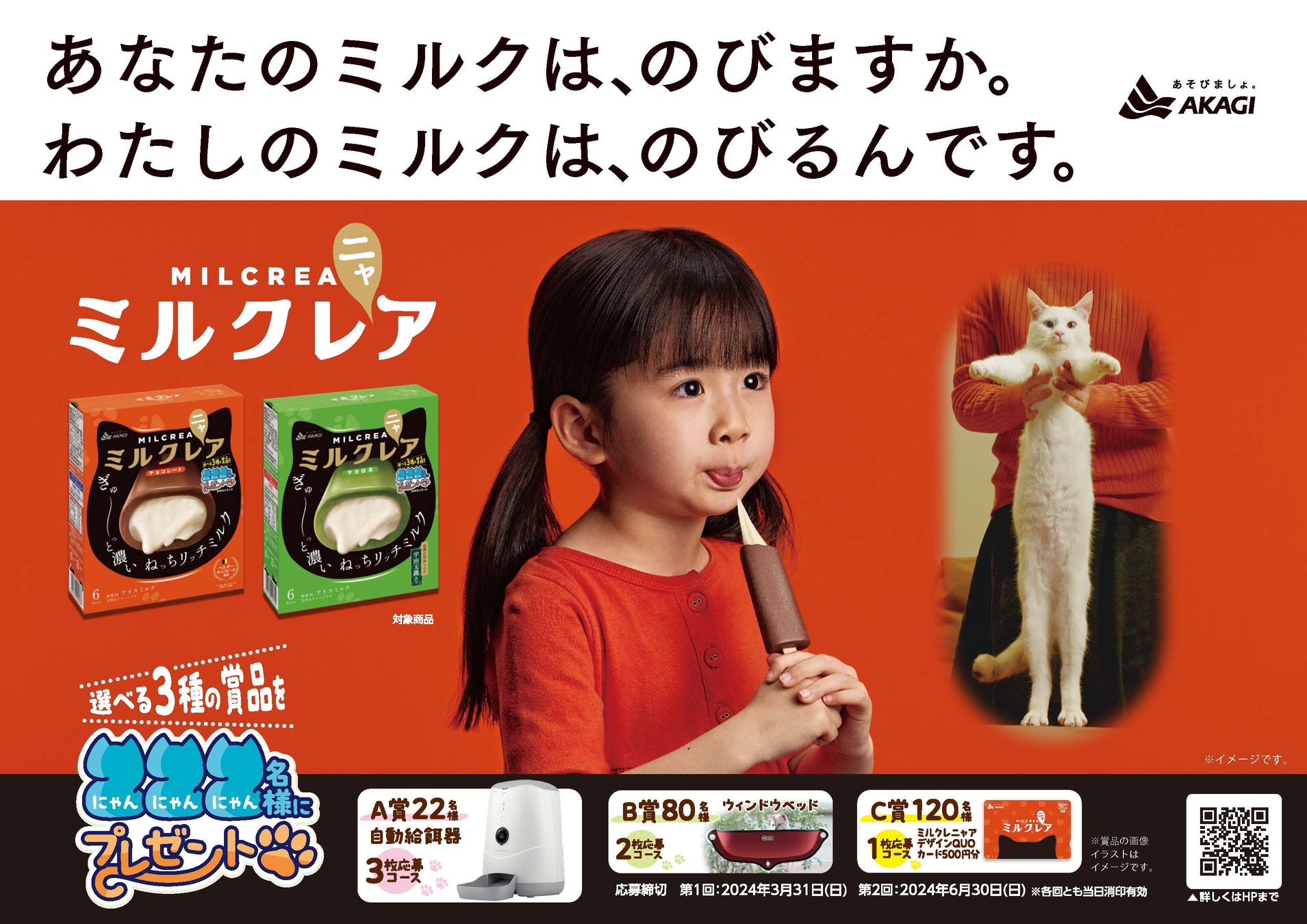 また、2023年に放映し、好評だったTVCM「伸びるんです」篇を2024年2月22日(木)よりオンエアいたします。踊りのようなリズミカルな音楽に合わせて、ミルクレアを食べる女の子と、ミルクレアのねっちり濃厚ミルクアイスのようによく伸びる白猫ちゃんとのシュールな世界観をお楽しみください。