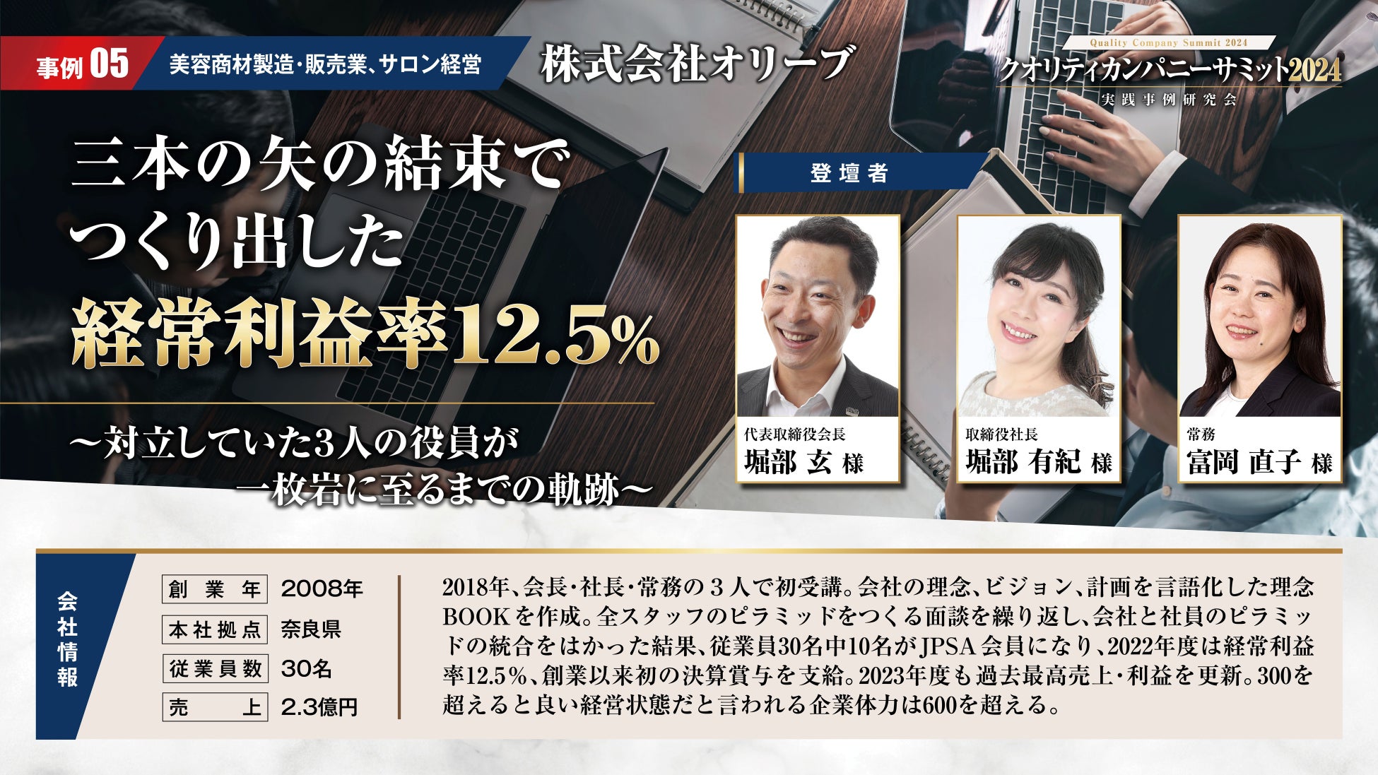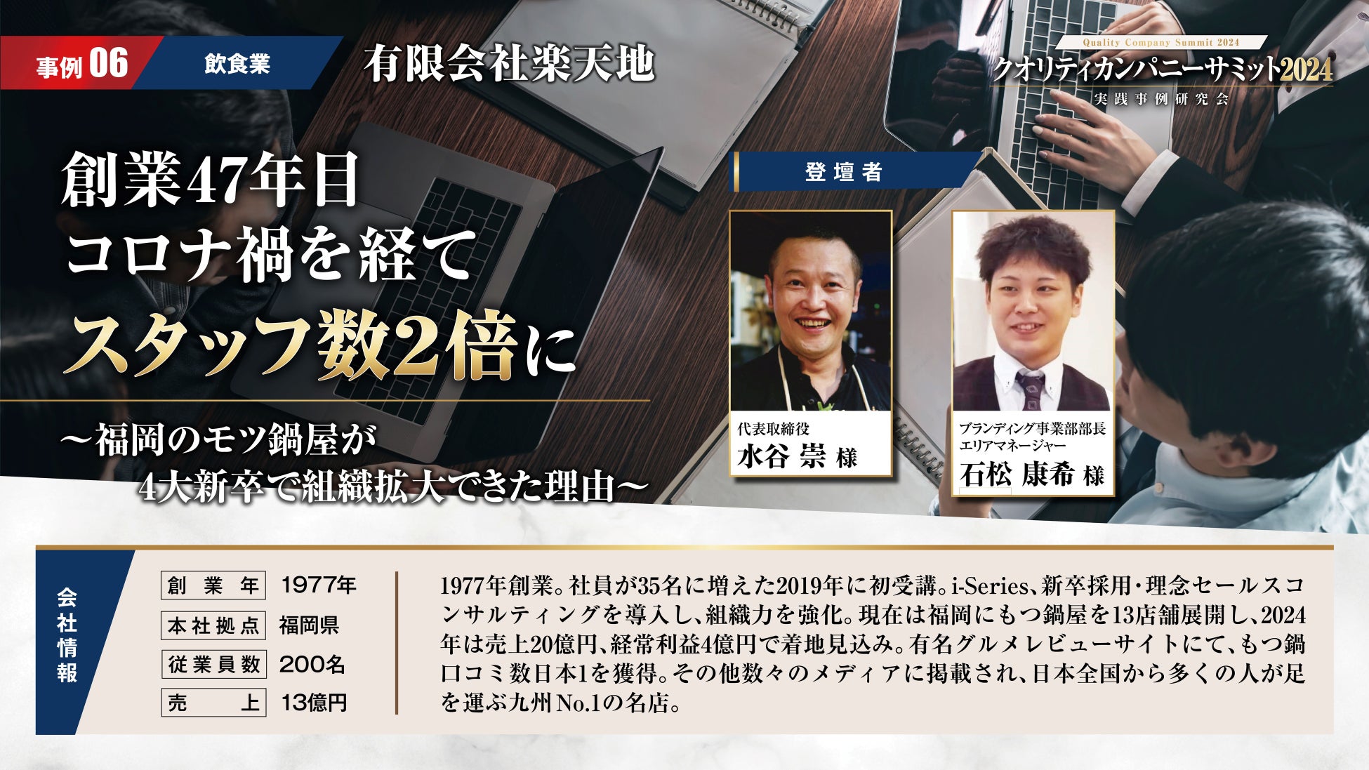 日本の「熱意あふれる社員」の割合は5%と世界最低水準が続いています。今、社会では営利を目的とする短期利己的な経営ではなく、社員、お客様、地域社会の幸せを経営の目的に据える「人軸経営」への変化が求められています。6月11日(火)には、⾼業績と良好な⼈間関係が両⽴された組織を目指すための「クオリティカンパニーサミット2024」を開催。全国から150名以上の経営者・幹部が参加を予定しています。