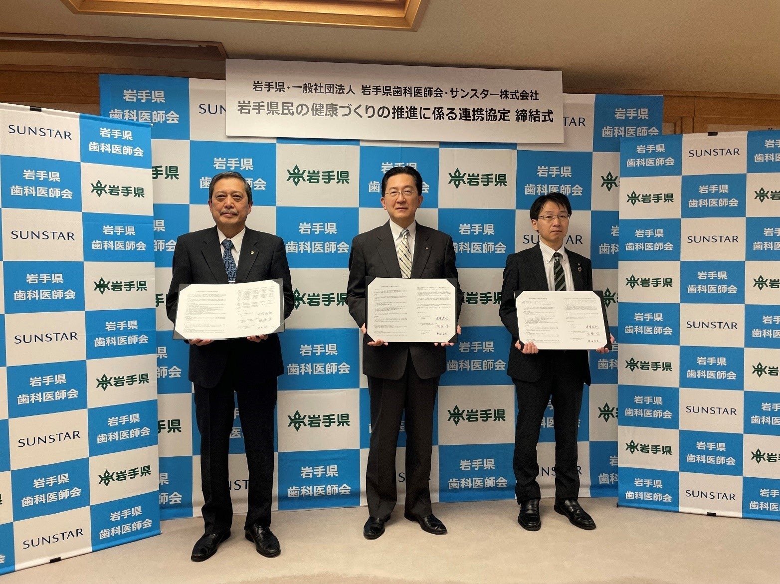 サンスター株式会社(以下、サンスター)は、岩手県、岩手県歯科医師会と協働し、県民の歯科口腔保健を通して健康づくりを推進する連携協定を締結し、2022年6月3日(金)に調印式を行いました。