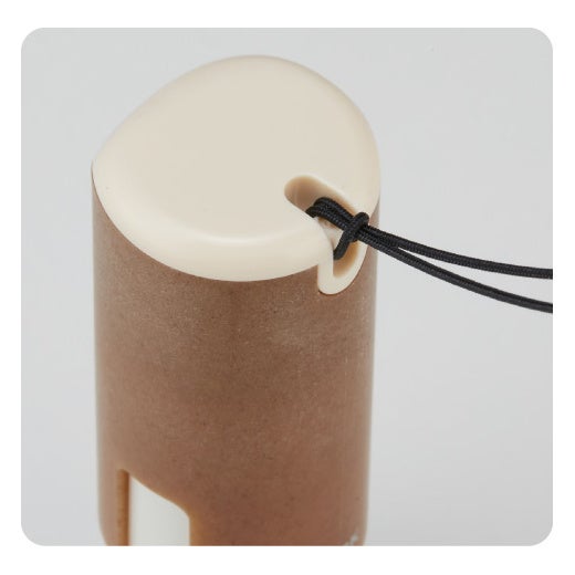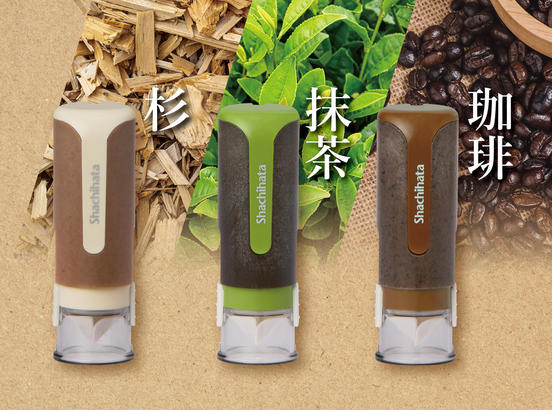 「キャップレス9 バイオマスプラスチック」は、環境に配慮した再生素材をホルダー部に使用したネーム印です。ラインナップは、杉の木くずを配合した「杉」、茶葉の不要部分を配合した「抹茶」、珈琲の豆かすを配合した「珈琲」の3種類。普段閉じている印面の先端のシャッターがなつ印動作の際に、自然に開閉するウイングシャッター機構の採用によりスマートになつ印ができます。