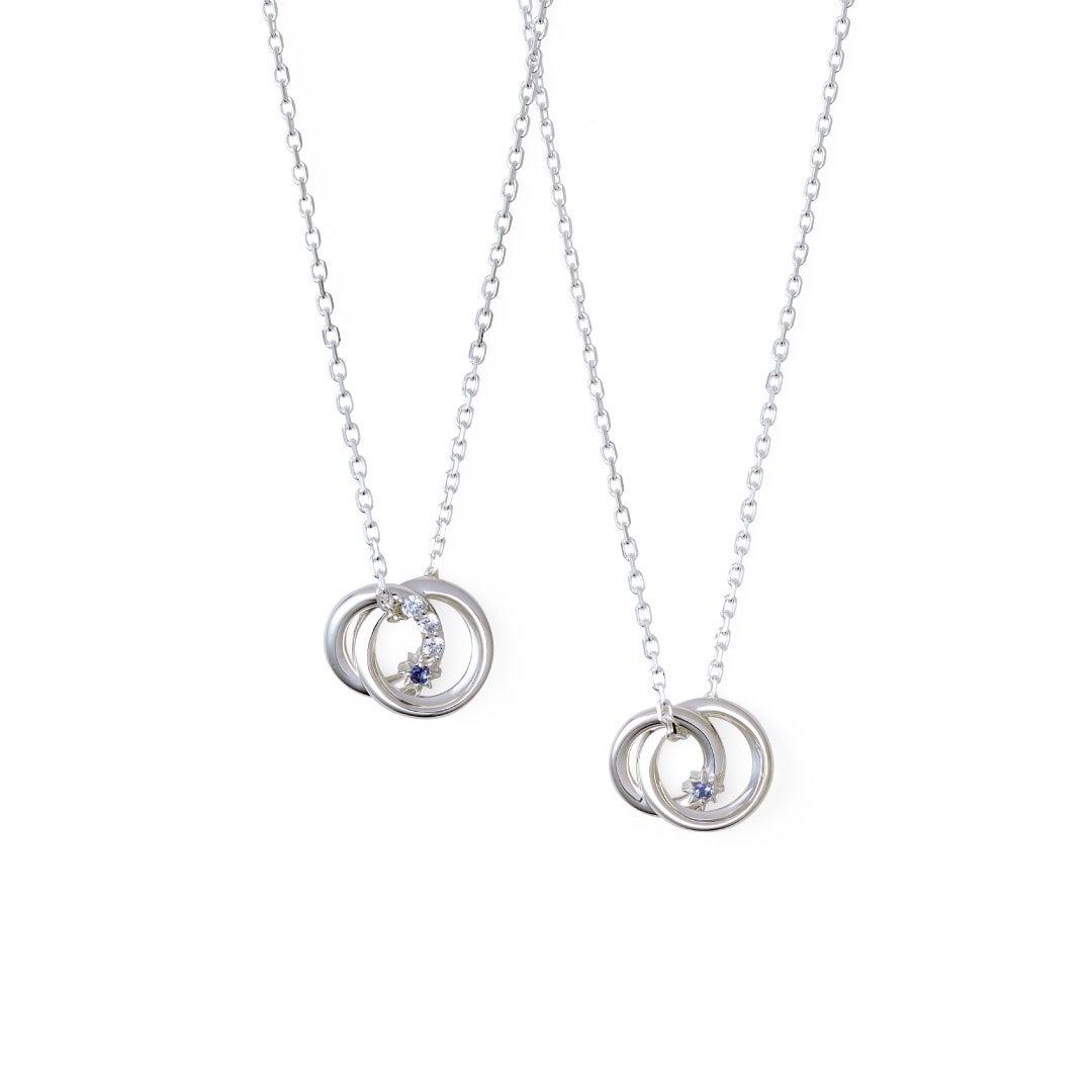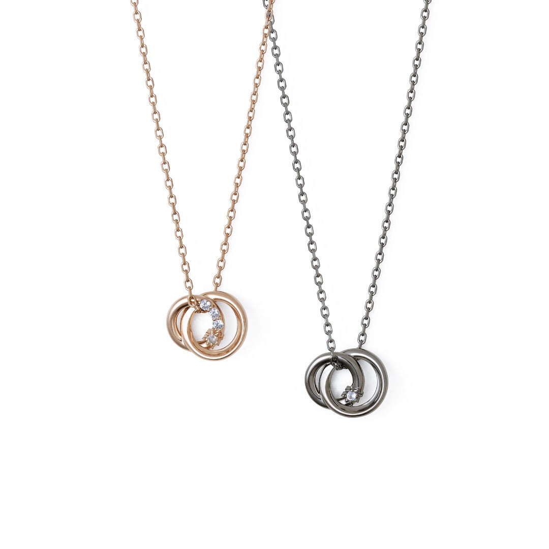 「繋がり」を意味する、寄り添うように重なり合うダブルリングのペアネックレス。